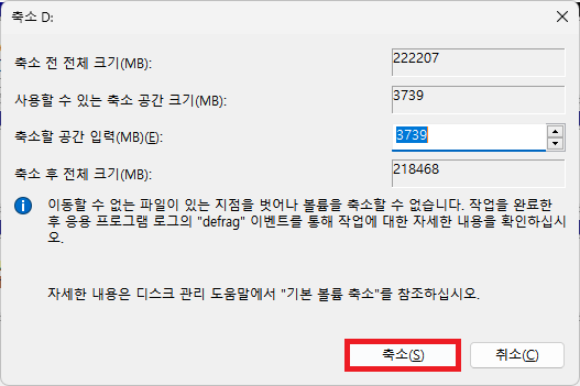 파티션을 선택하였으면 아래 예문을 참고하여 파티션을 축소한다.