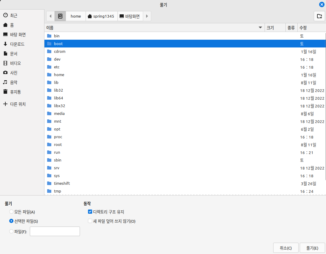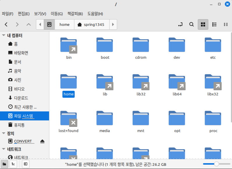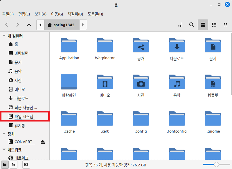 일단 파일 탐색기를 연 뒤, '파일 시스템' 항목을 눌러 최상위 디렉터리인 root로 이동한다.