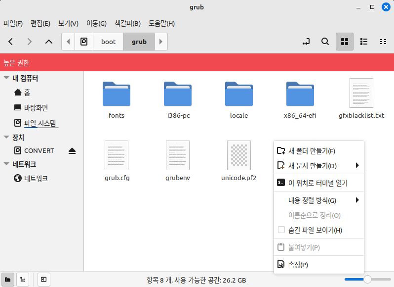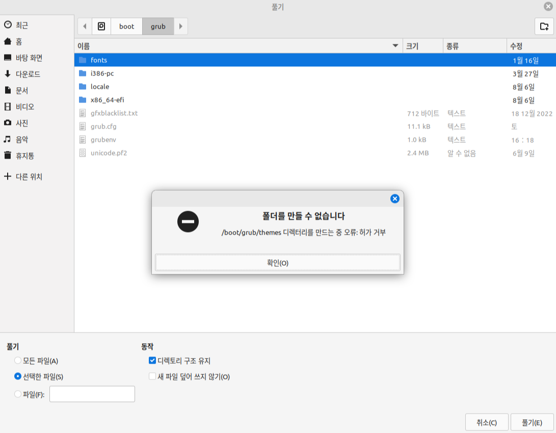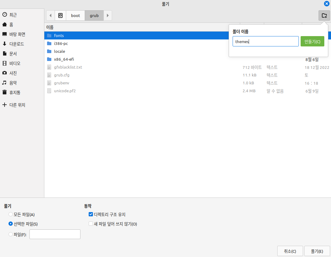 관리자 권한으로 열린 파일 탐색기를 이용하여 "/boot/grub" 디렉터리로 이동한 뒤, "themes" 폴더를 만든다.