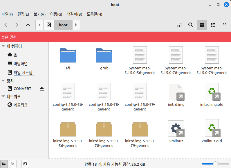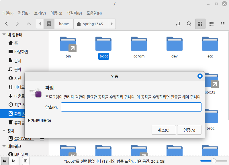 즉, sudo 권한으로 파일 탐색기를 실행해야 저 디렉터리에 폴더를 만들 수 있다.