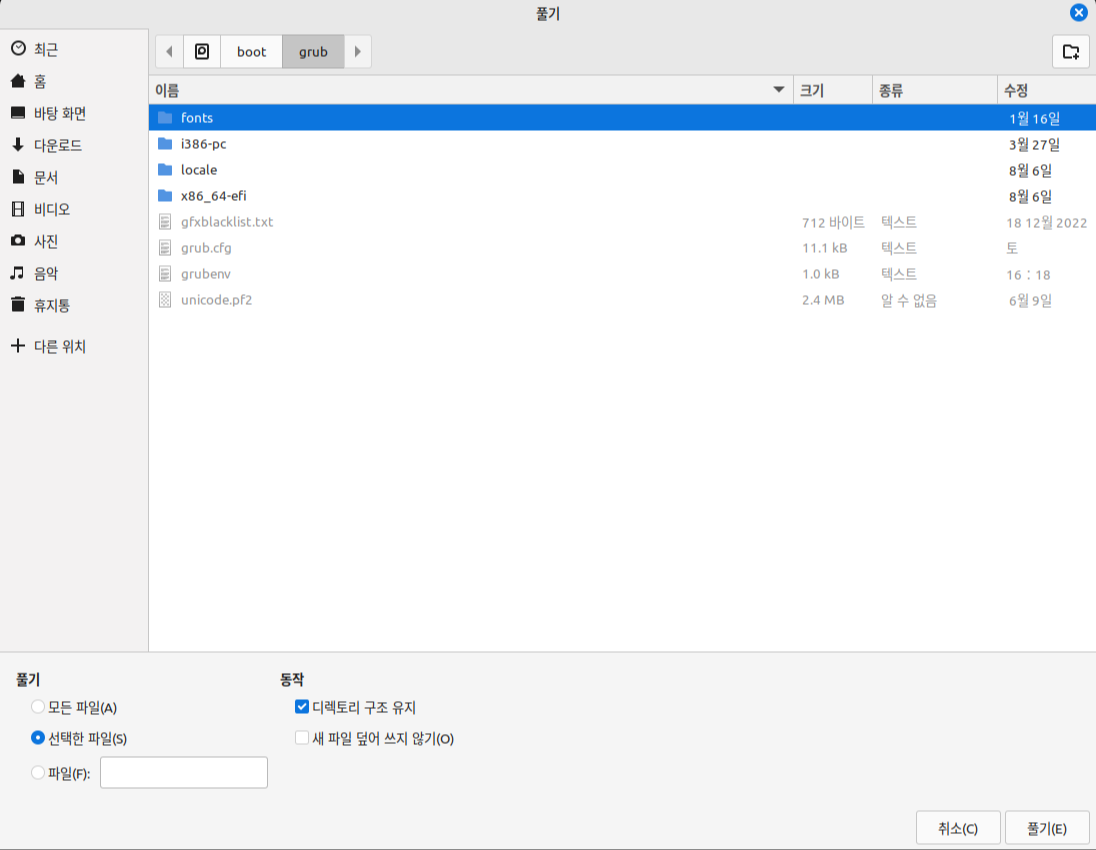 어쨌든, 위의 방법대로 테마를 "/boot/grub/themes" 디렉터리에 압축 해제한다.