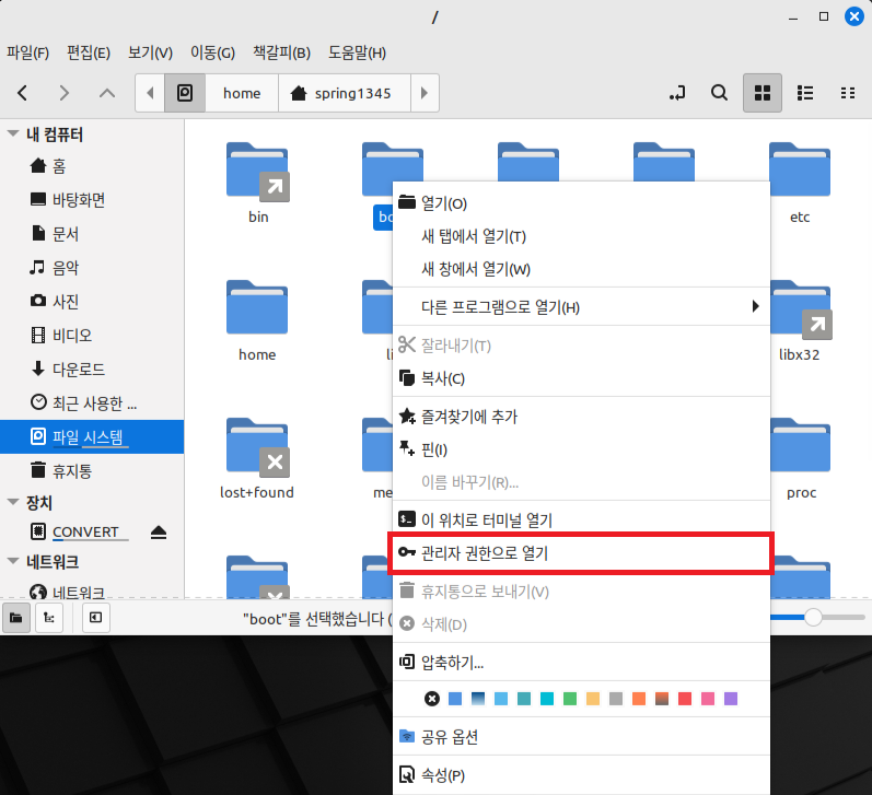 "boot" 폴더를 우클릭하여 컨텍스트 메뉴를 연 후, '관리자 권한으로 열기'를 누른다.