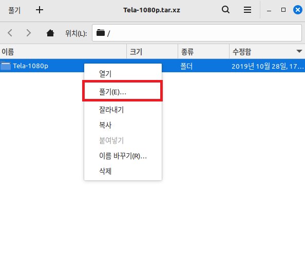 내려받은 파일을 우클릭하고, '풀기'를 누른다.