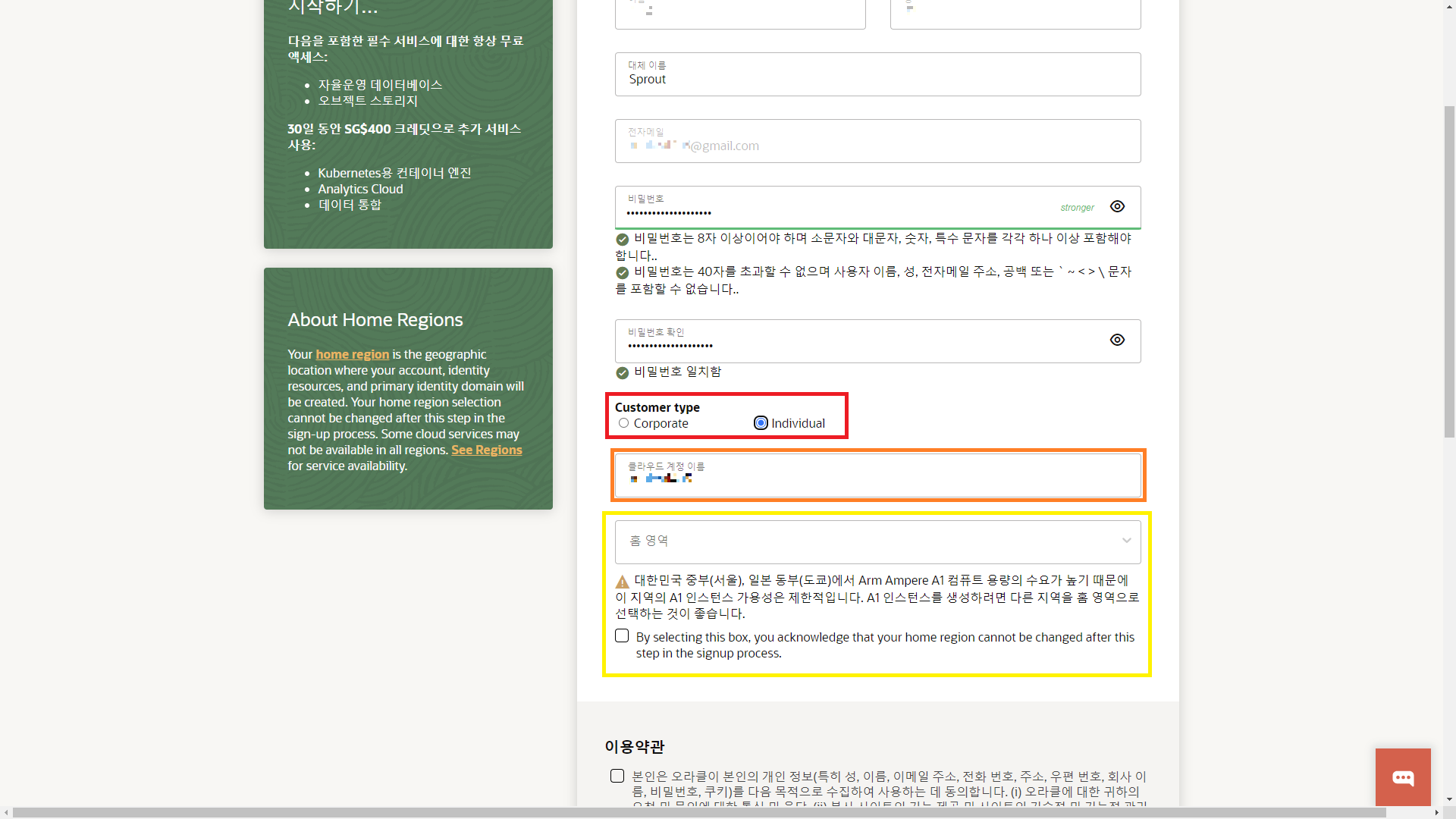 'Customer Type'은 자신이 기업과 개인 중 어떠한 범위로 계정을 만들 것인지를 지정한다. 기업 명의로 사용하지 않는 대부분의 경우 'Individual'을 선택하면 된다.