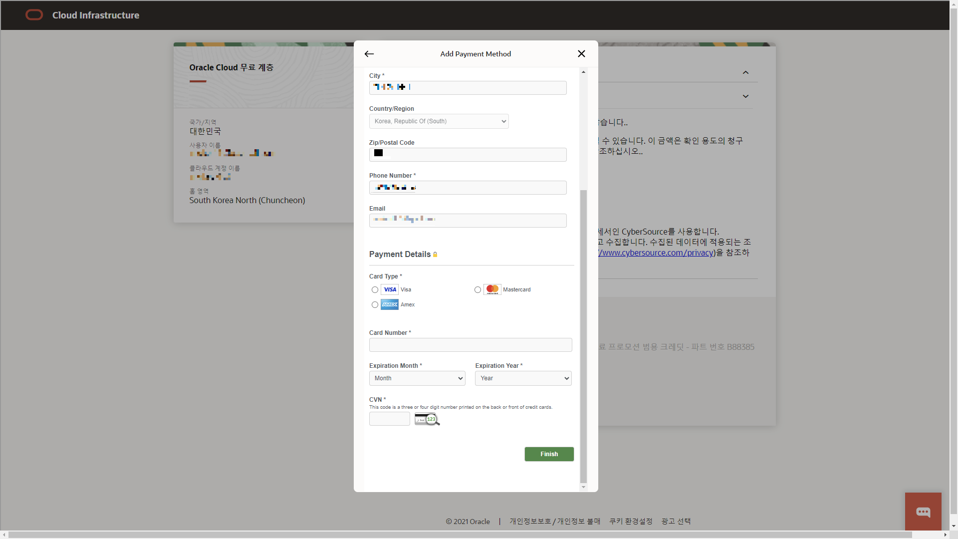 아래로 스크롤하여 결제 정보를 입력하고, [Finish]를 누른다.