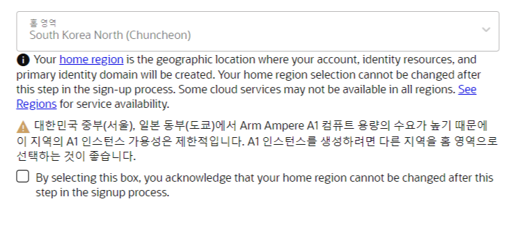 '홈 영역'은 가장 중요한 단계로, VM 인스턴스를 어디에 만들 것인지 지정하는 단계이다. 클라우드 계정 이름과 같이 한번 지정하면 바꿀 수 없으며, 사람이 많이 몰리거나, 너무 멀리 떨어진 지역은 VM 인스턴스를 이용하는데 불편함이 있을 수 있다(당장 이미지에서 보이듯 서울과 도쿄 영역에서는 사용에 지장이 있을 수 있다고 나온다).