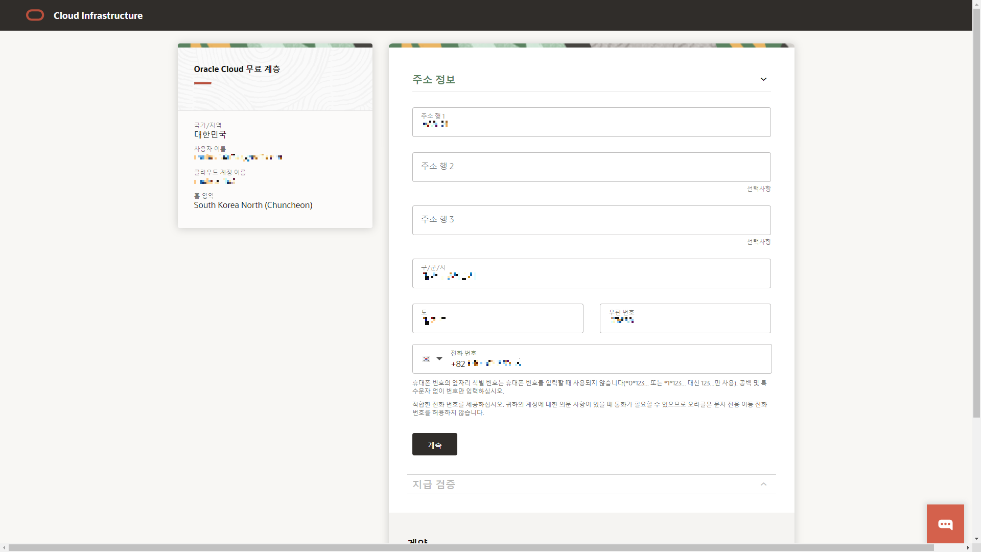 [계속]을 누르면 넘어간 페이지에서 거주지 주소, 전화번호 등을 입력한다.