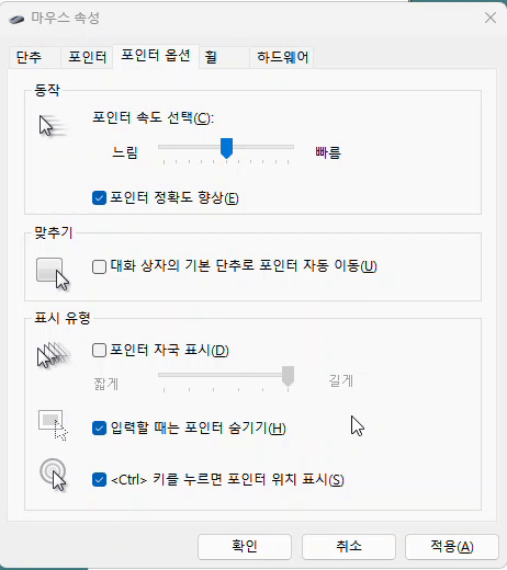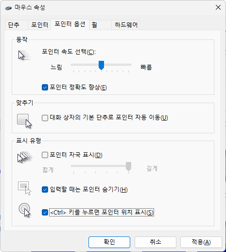 이걸로도 마우스 포인터 위치가 잘 보이지 않는다면 별도의 프로그램을 설치해 사용할 수 있다.