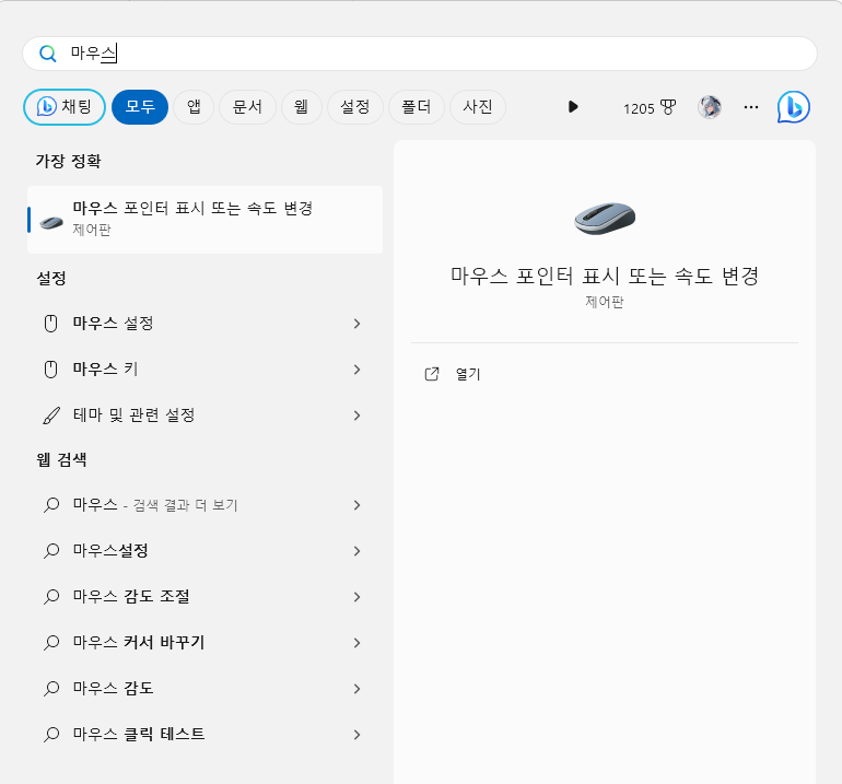 검색에서 [마우스 포인터 표시 또는 속성 변경]을 누른다.