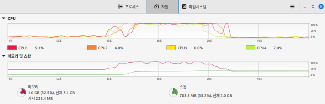 가용 메모리가 부족하자 시스템에서 디스크 스왑을 사용하는 것을 알 수 있다.