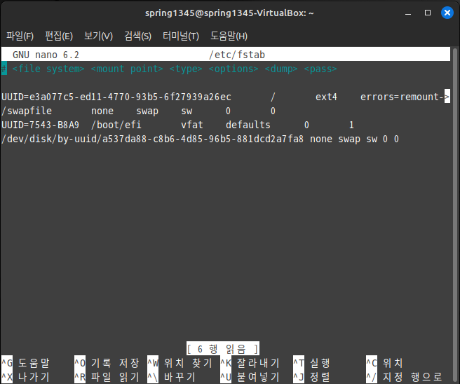 경우에 따라, 재부팅 후에 운영체제에서 사용자가 설정한 디스크 스왑 기능을 사용하지 않는 경우가 있는데, 이럴 때에는 /etc/fstab 파일을 에디터로 연 후 항목을 추가하여야 한다.