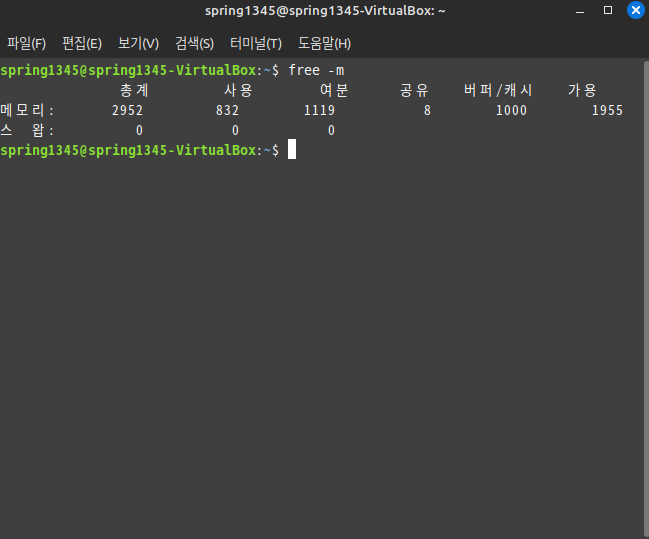 Swap 부분이 0으로 표기되므로, 운영체제가 디스크 스왑 기능을 사용하고 있지 않다는 것을 의미한다.