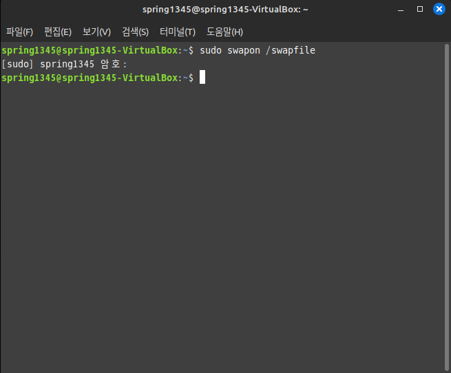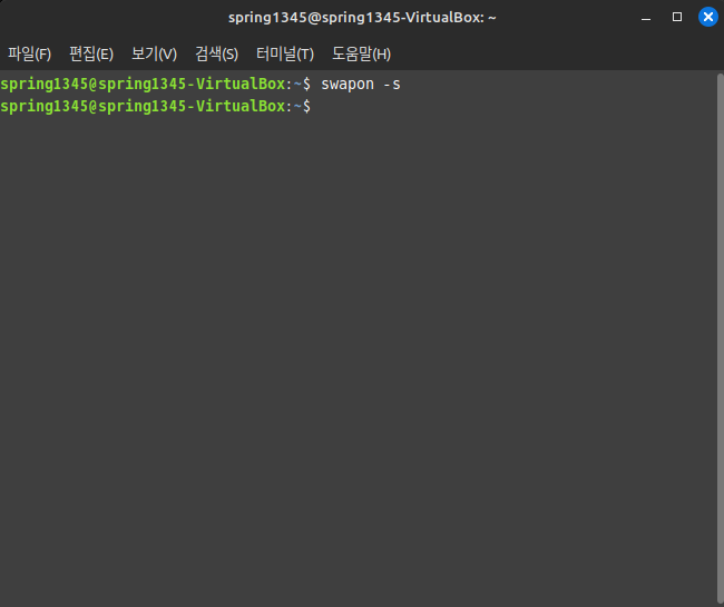 이 명령줄은 스왑 파일이 지정되어 있는지를 확인하는 명령줄로, 아무런 메시지가 출력되지 않는다면 스왑 파일이 존재하지 않는다는 의미(=디스크 스왑 기능이 사용되지 않는다는 의미)이다.