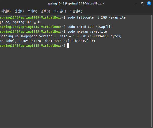 파일을 생성하였지만 지금 단계에서는 그저 2GB의 파일을 만들었을 뿐이며, 이 파일을 스왑 파일로 만들려면 몇 가지 작업이 필요하다.