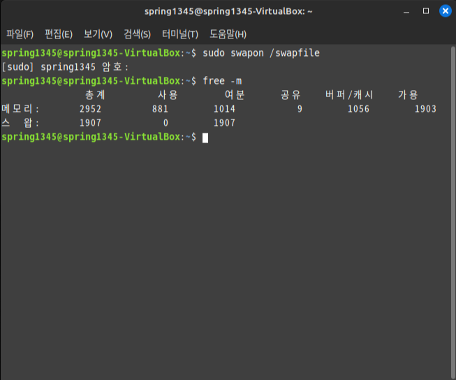 해당 명령줄을 입력하면 시스템에서 위 이미지에서처럼 스왑 파일에 저장된 내용물을 메모리로 옮기는데, 시간이 조금 걸리므로 기다리자.