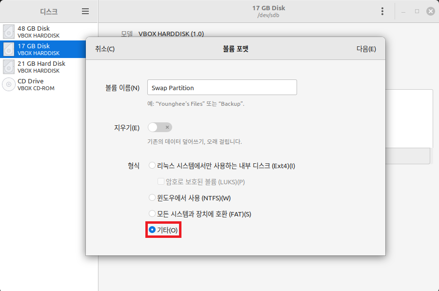 파티션 포맷의 형식을 [기타]로 지정한다.