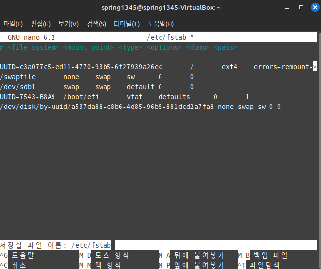 이럴 때에는 FSTAB 파일에 적힌 파티션의 순서를 변경해 주거나 항목을 삭제해 주는 등의 조치가 필요하다.