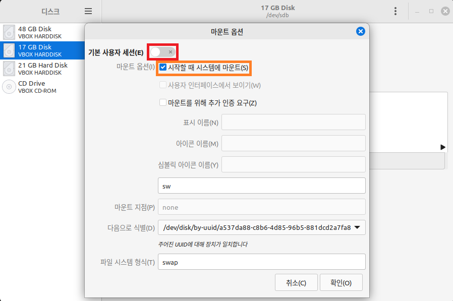 [기본 사용자 세션]을 해제하고, [시작할 때 시스템에 마운트]를 선택해 준다.