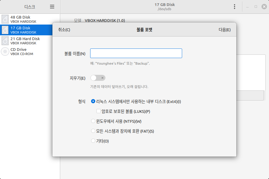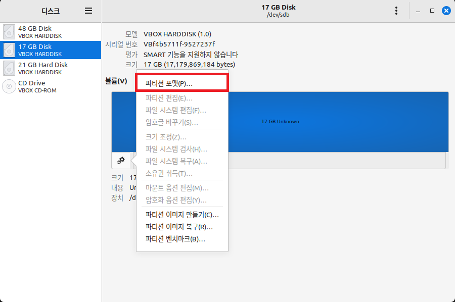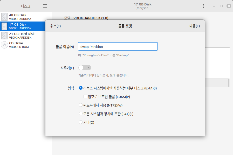 이 글에서는 보다 쉽게 스왑 파티션을 구성하기 위해, 새로운 가상 하드 디스크를 하나 만들어서 진행하였다.