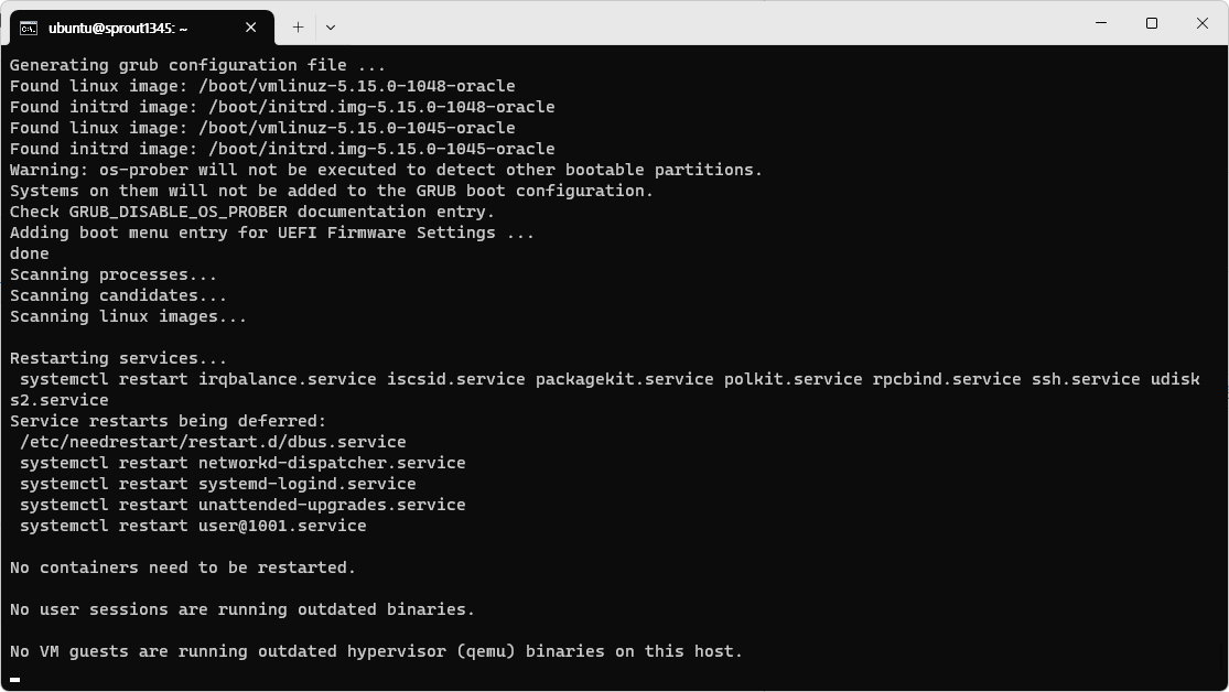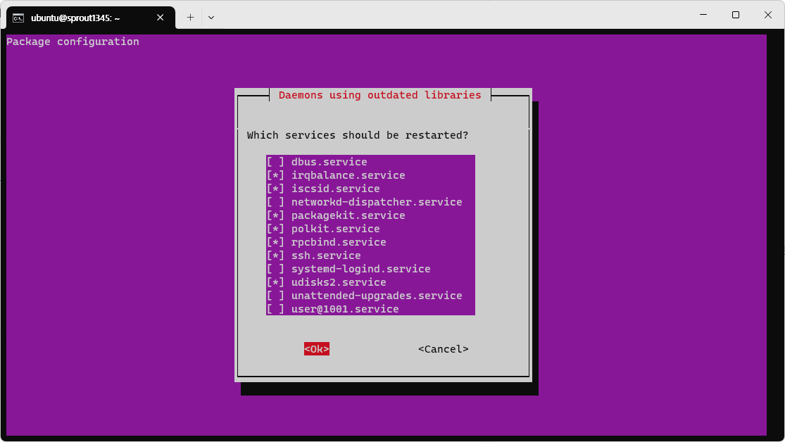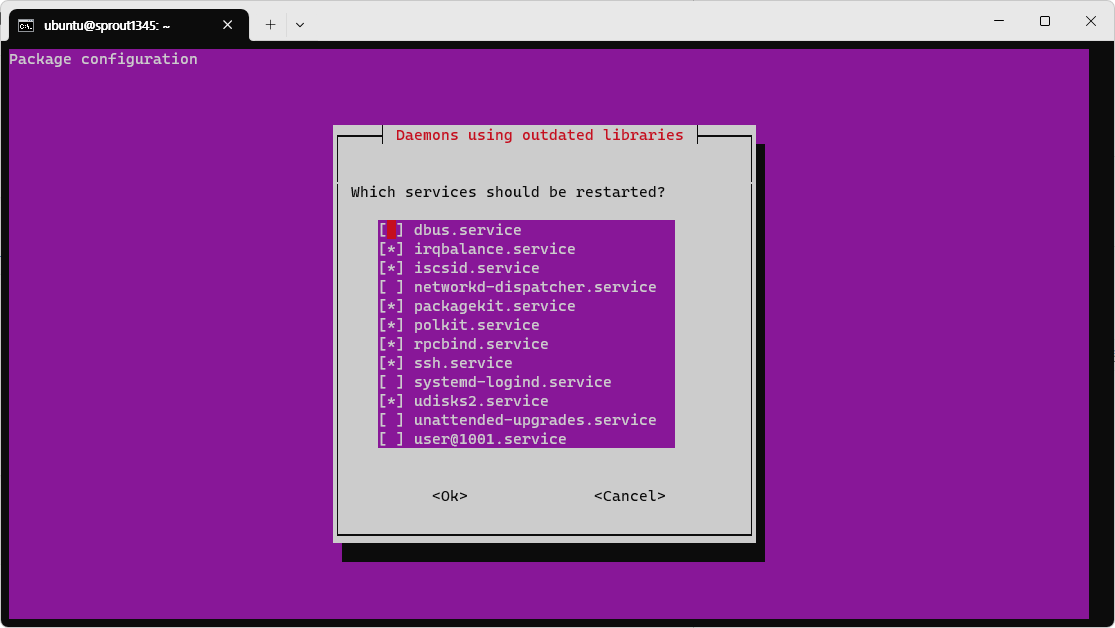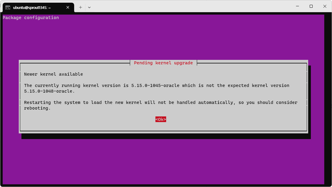 지금은 그냥 넘어가도 된다. 어차피 커널 업그레이트 때문에 재부팅을 해야 하기 때문이다. 재부팅을 하면 서비스가 다시 시작되므로 굳이 서비스를 재시작할 필요가 없다.