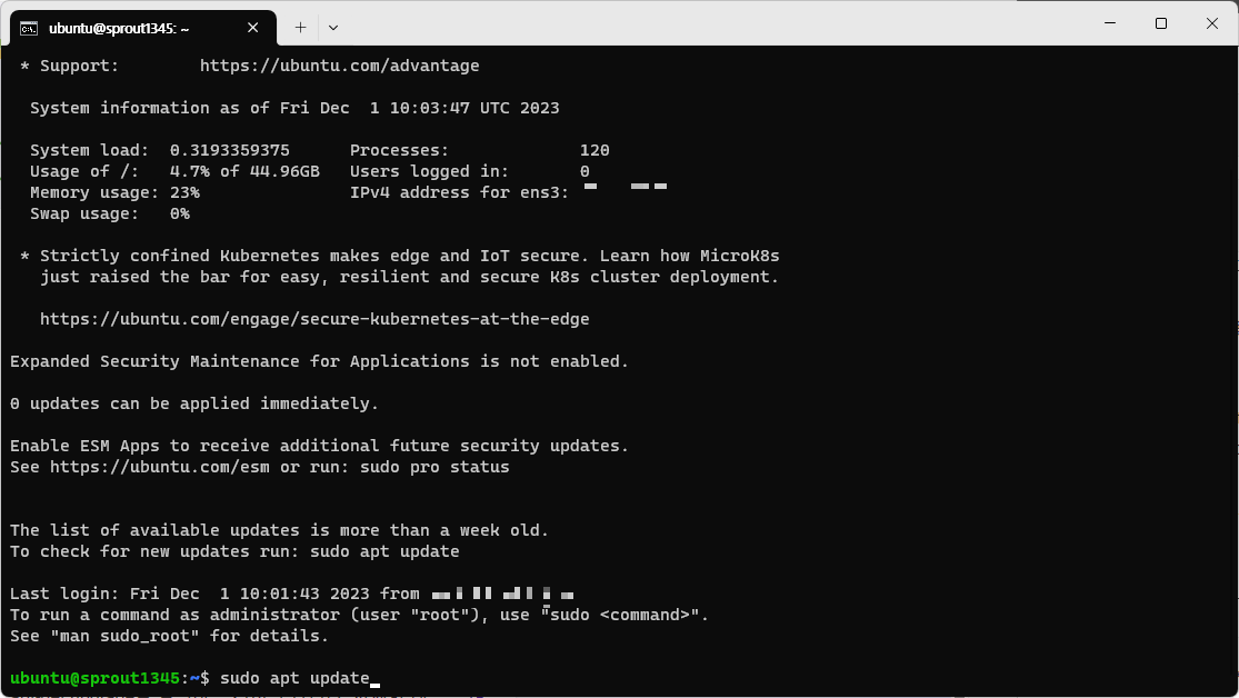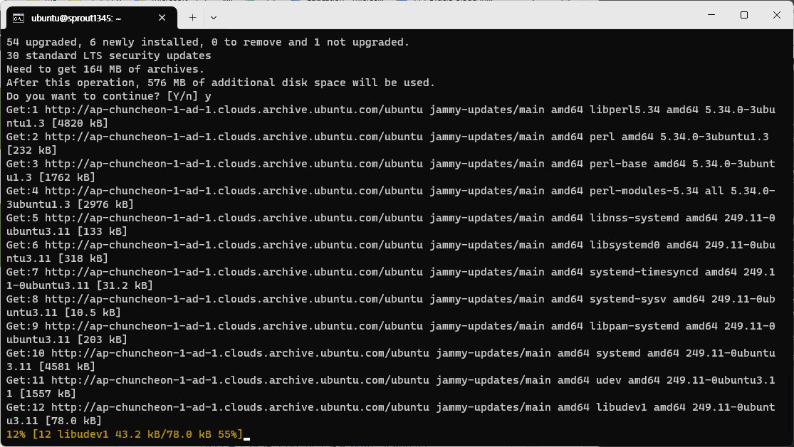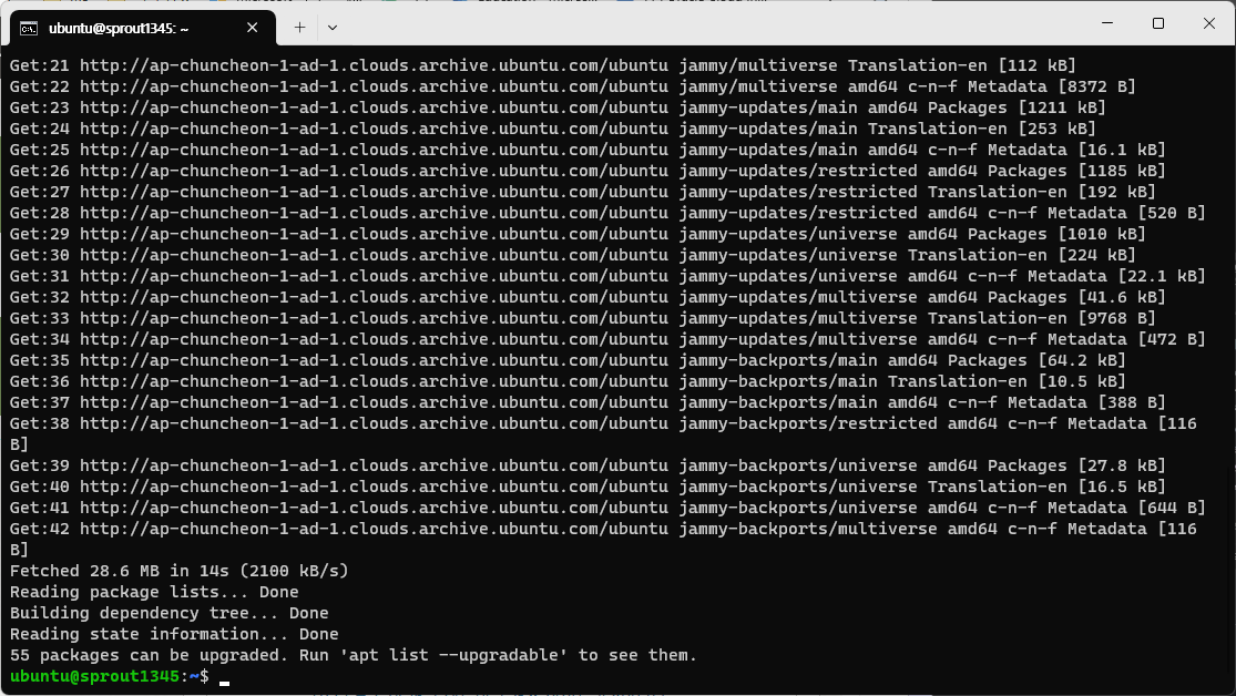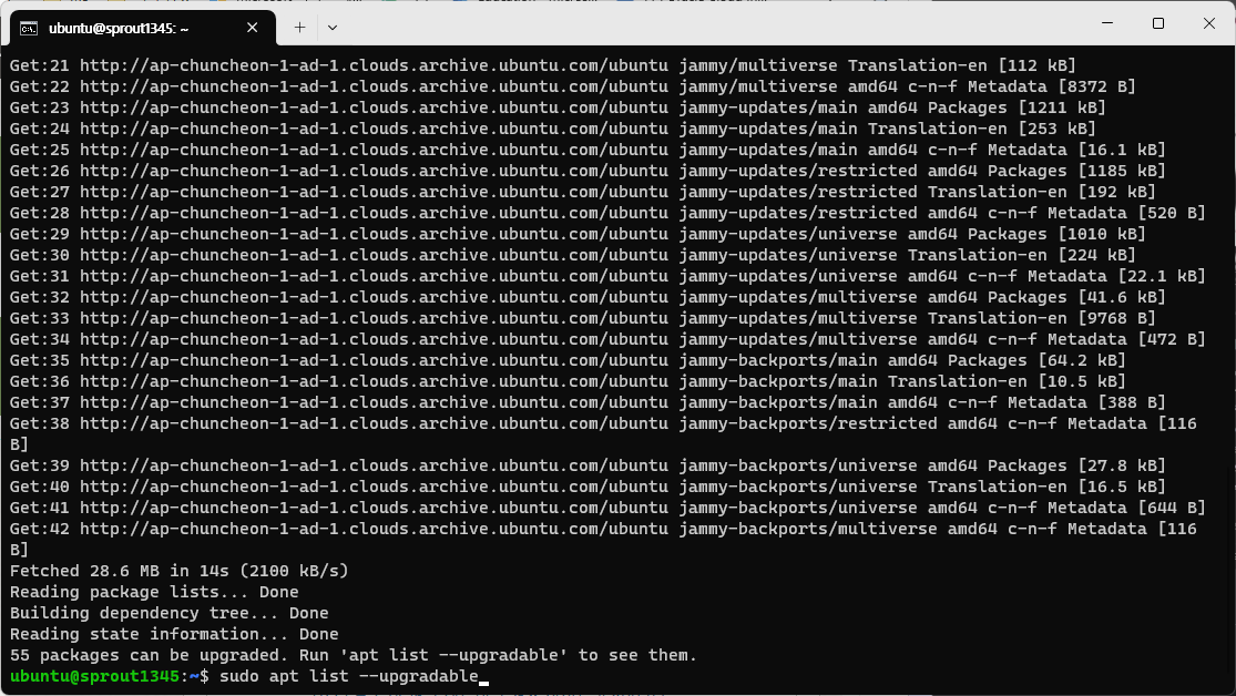 서버용 우분투라고 해도 그 근본은 변하지 않는다. sudo를 붙이는 것을 잊지 말자. 별도의 설정을 하지 않는다면 비밀번호를 묻지 않는다.