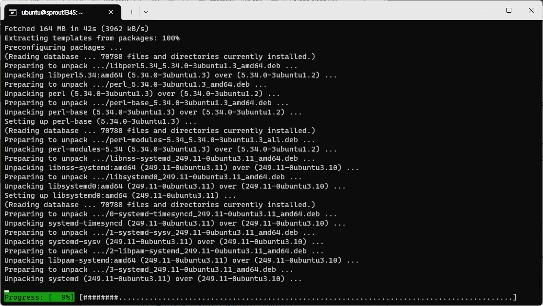 그러면 머신이 재부팅되며 업데이트 및 업그레이드가 끝난다. 연결은 끊어지지 않는다.