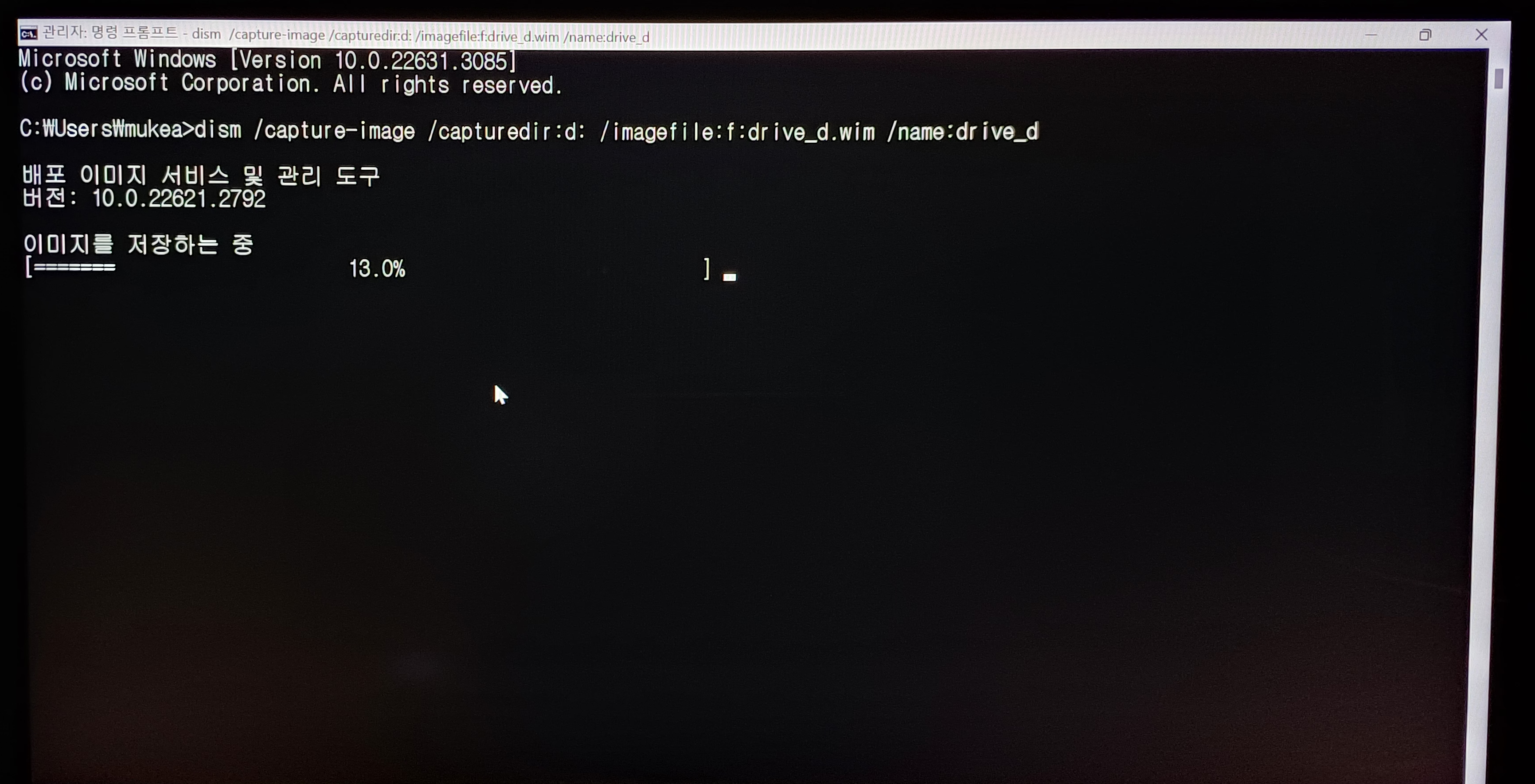 DISM /capture-image /capturedir:"캡쳐할 드라이브의 문자" /imagefile:"이미지 파일을 저장할 경로" /name:"내부적으로 사용할 이미지 이름"