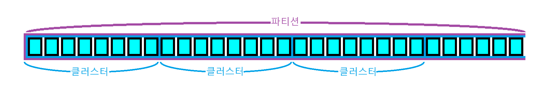 그리고 운영체제는 이렇게 배열된 섹터를 일정한 크기로 묶어 클러스터를 형성하고, 이를 다시금 묶어 파티션을 형성한다.