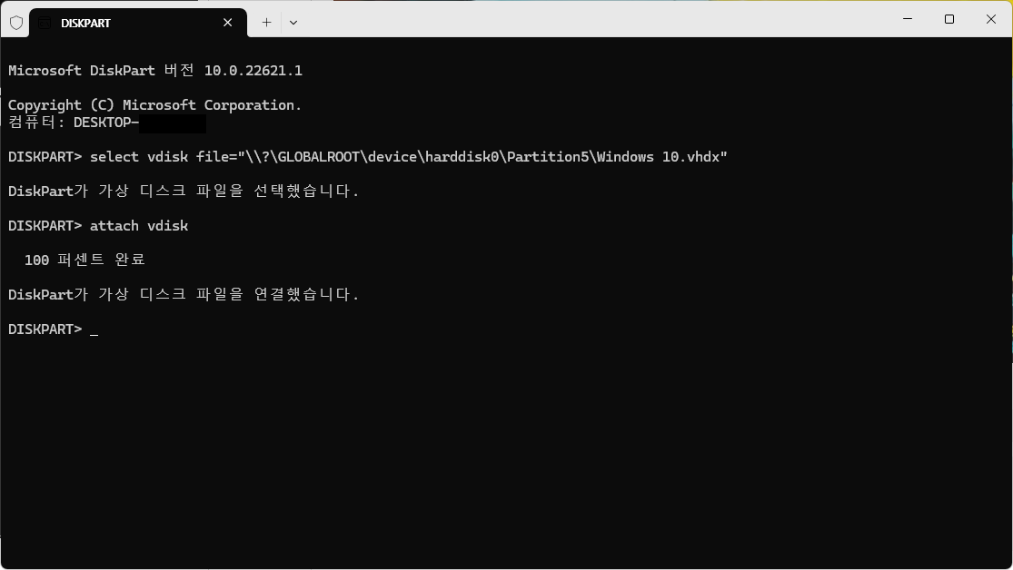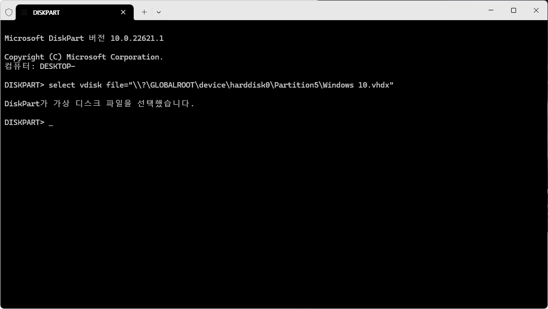 해당 명령이 정상적으로 실행되면 "DiskPart가 가상 디스크 파일을 선택했습니다."라고 응답한다.