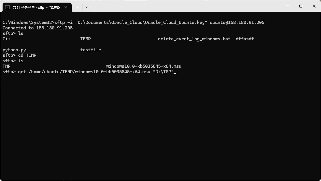 예를 들어, 원격 컴퓨터의 "/home/ubuntu/TEMP/windows10.0-kb5035845-x64.msu" 파일을 로컬 컴퓨터의 "D:\TMP" 디렉터리로 내려받고 싶다면 아래와 같이 입력한다.