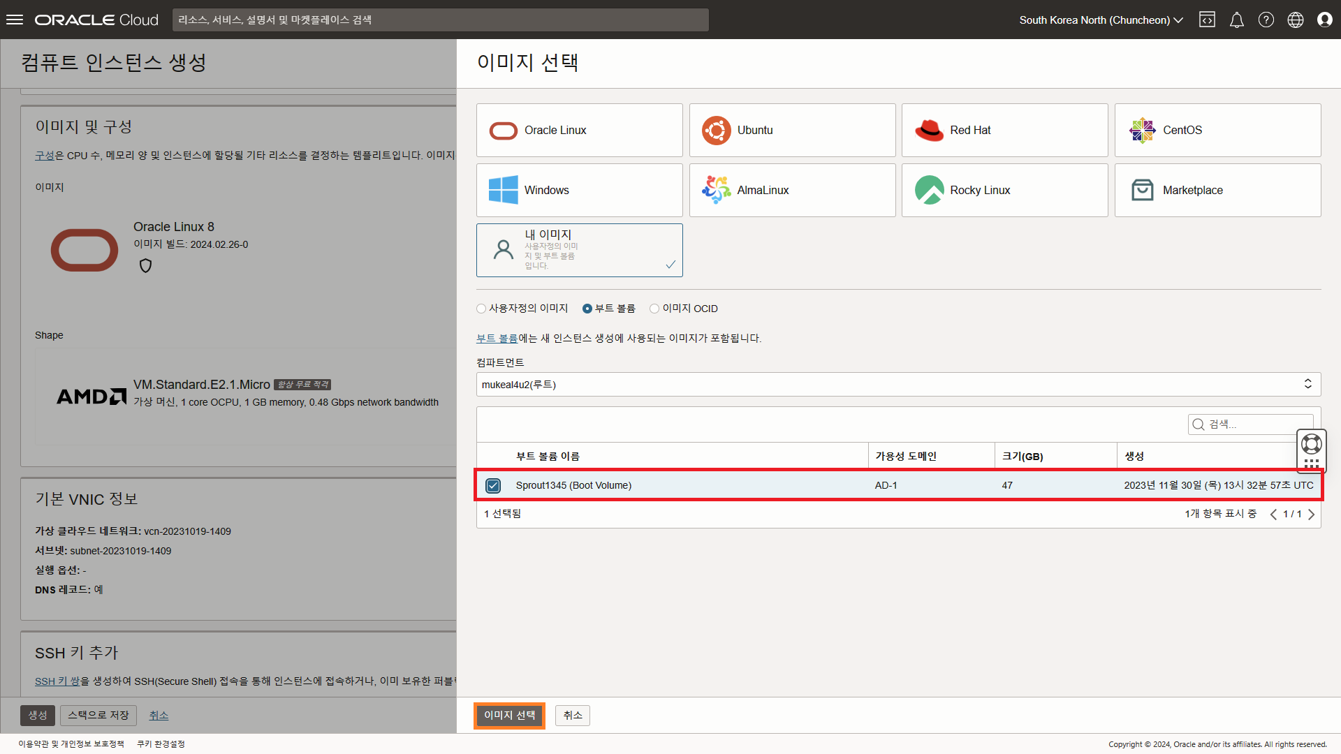 이미지는 기존에 사용하던 부트 볼륨을 지정한다. 새로 이미지를 만들고 싶다면 이미지 목록에서 새롭게 하나를 선택한다.