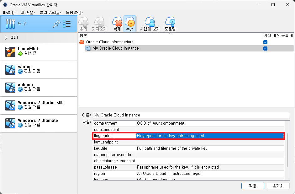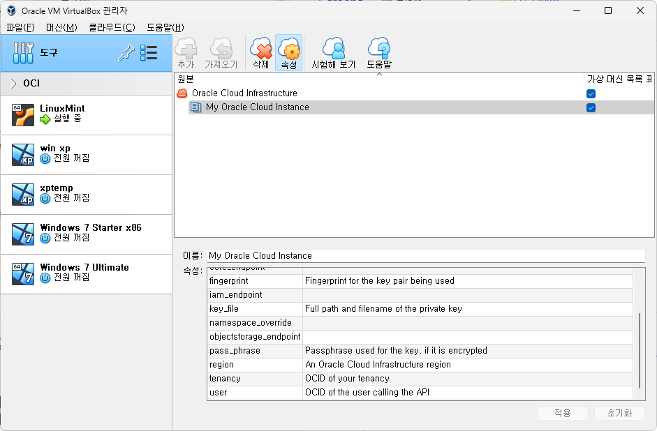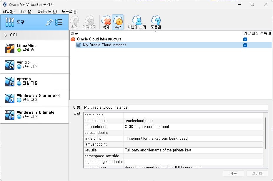 VirtualBox Oracle Cloud 프로필 상세