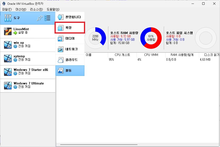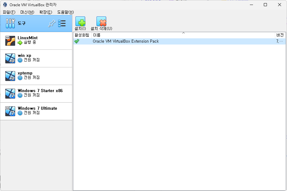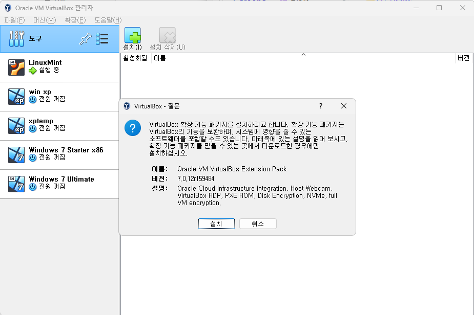 확장팩을 내려받았으면 VirtualBox의 확장 메뉴로 들어가서 확장팩을 설치한다.