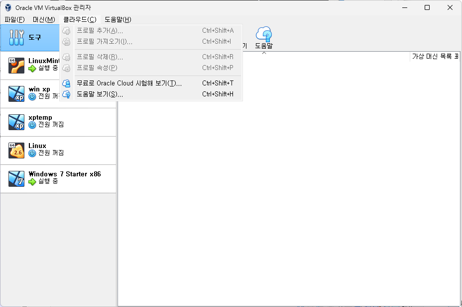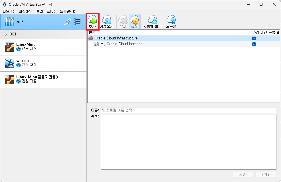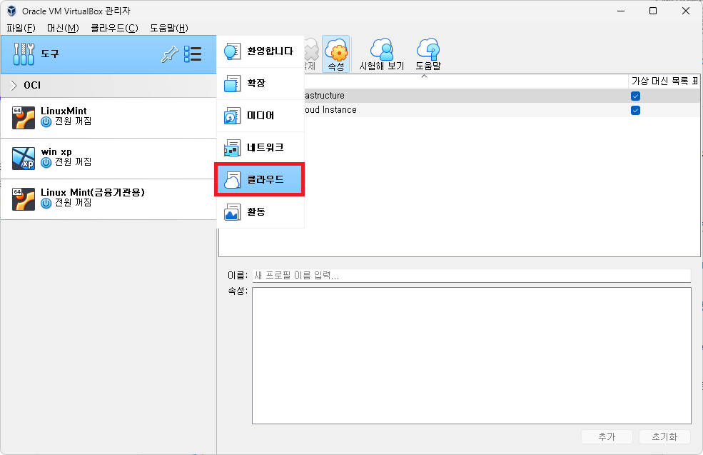 VirtualBox 클라우드 프로필 추가