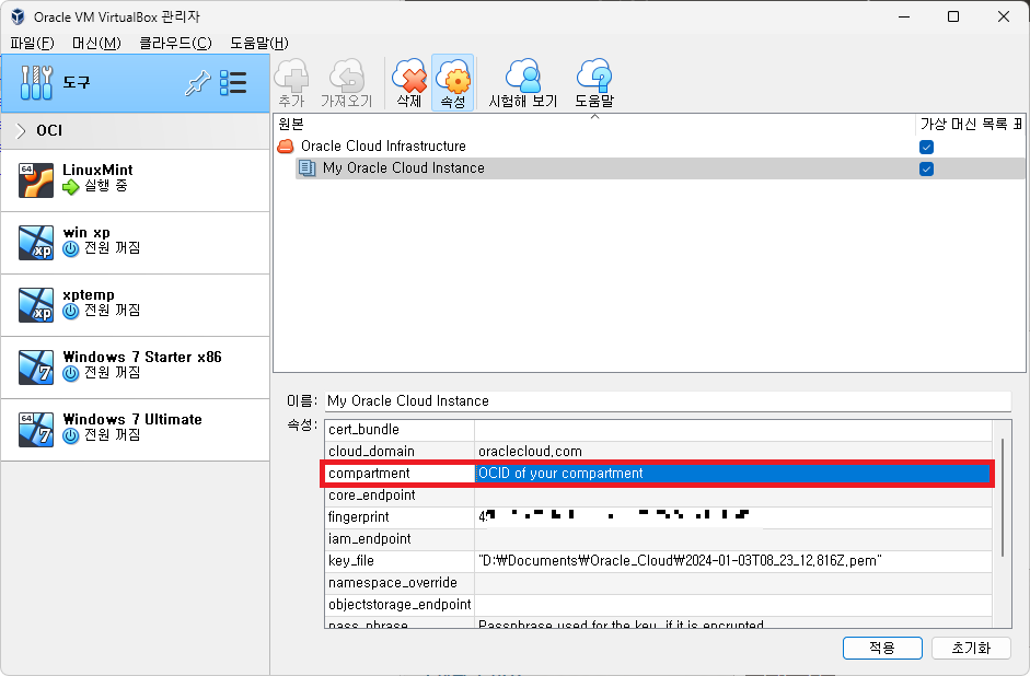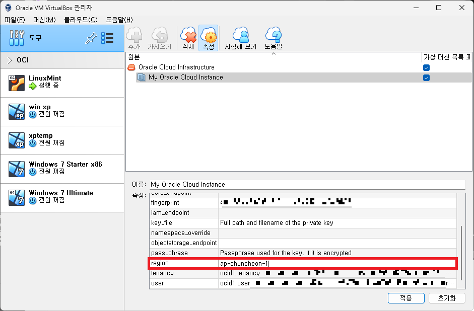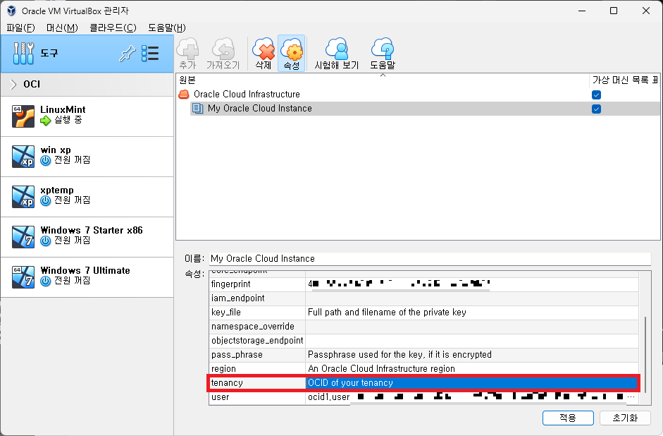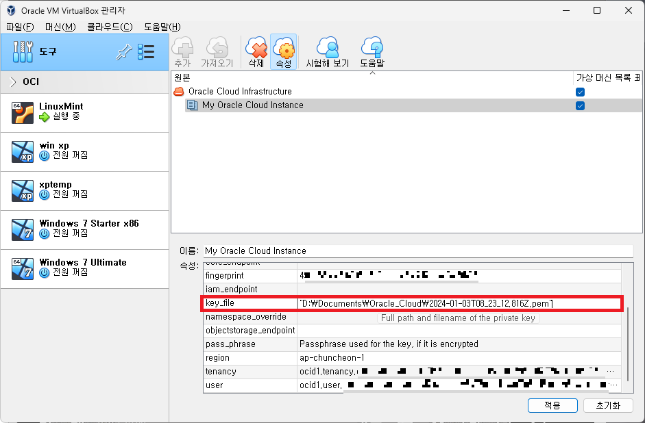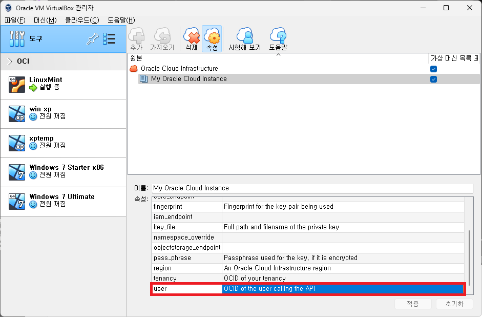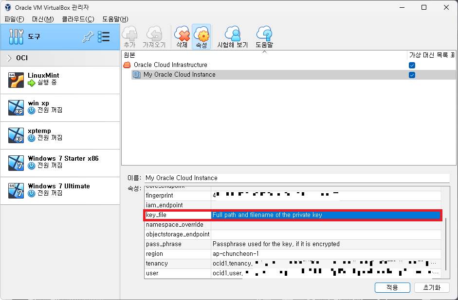 하단에 빈 항목을이 많은 것을 볼 수 있는데, VirtualBox에서 Oracle Cloud에 접근하기 위한 정보들이다.
