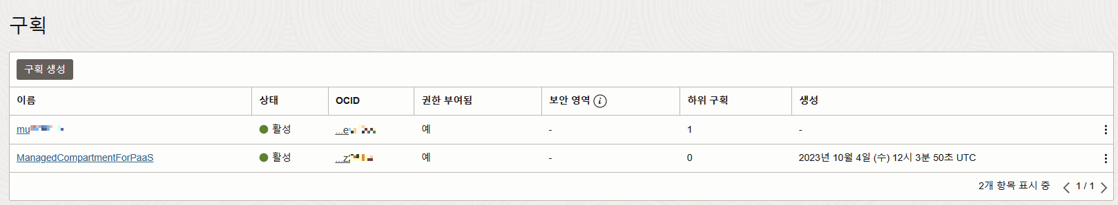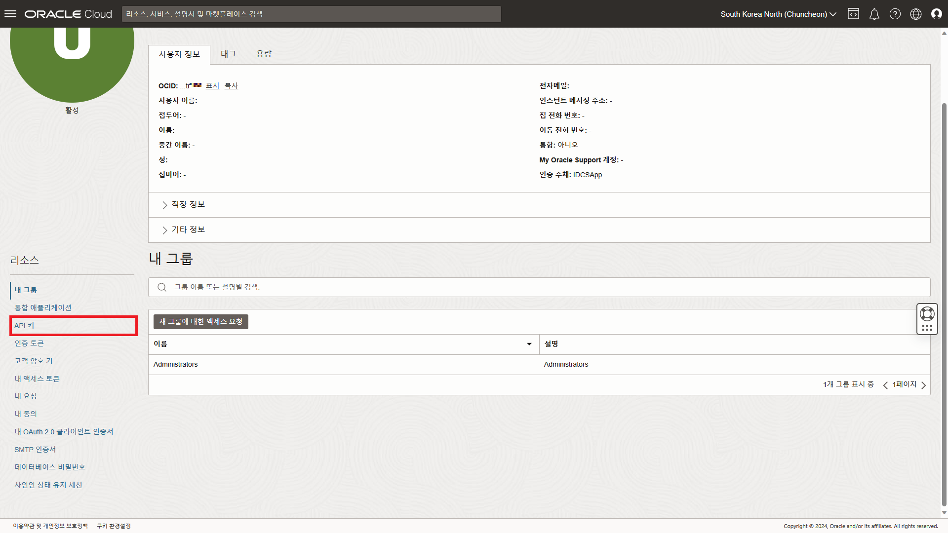 그러면 좌측 OCI 목록의 "접근할 수 없음"이 "비어 있음"으로 바뀔 것이다.