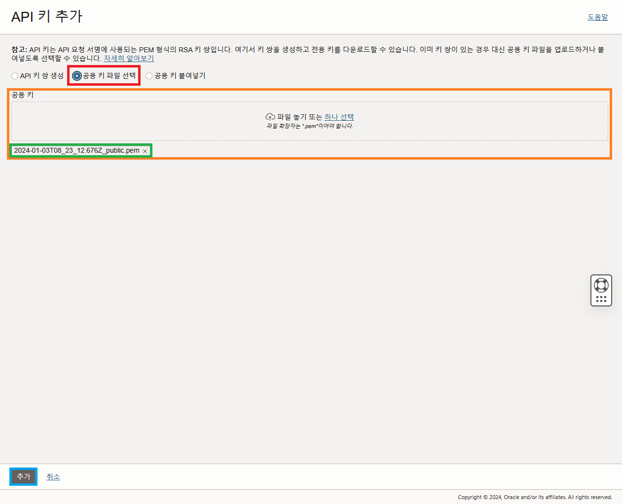 '공용 키 파일 선택' 창에서 내려받은 두 키 중, "_public.pem" 확장자를 가지고 있는 공용 키를 업로드한다.