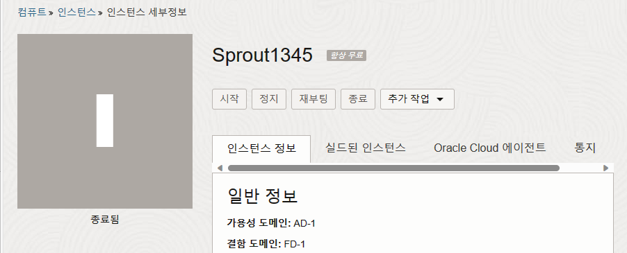 인스턴스가 종료된 상태에서 [시작]을 누르면 다시 인스턴스를 할당받아 구동할 수 있다.