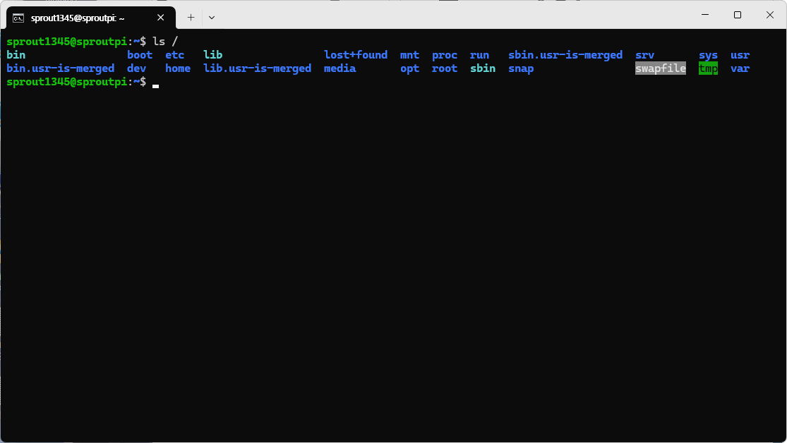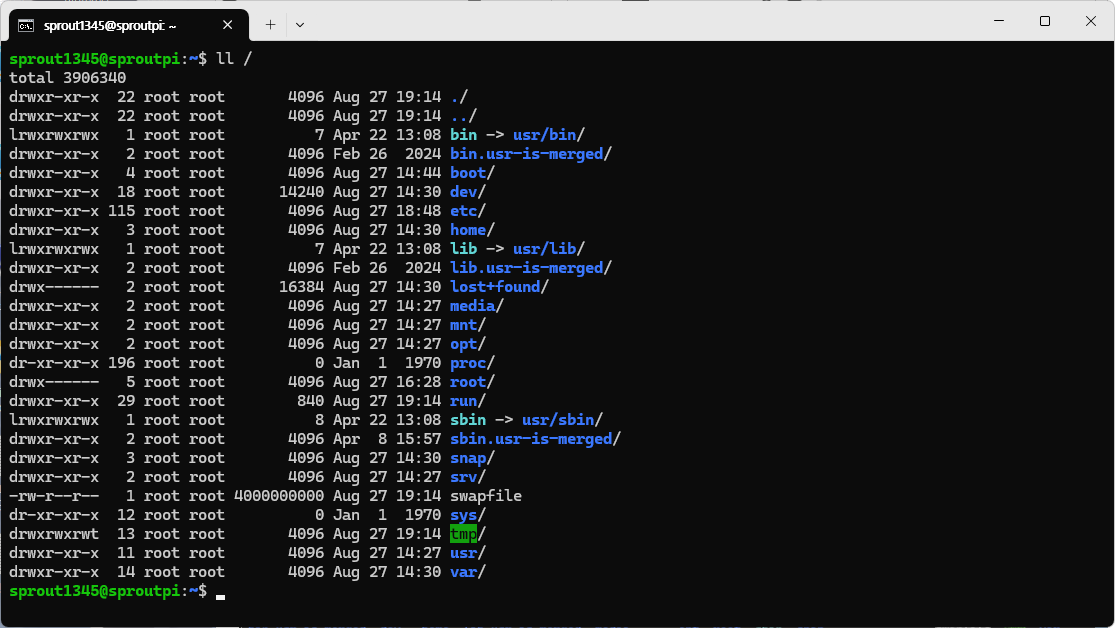 스왑 파일이 정상적으로 생성되었는지 확인하려면 "ls /" 또는 "ll /"을 입력한다.