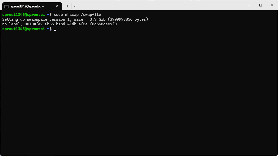 해당 명령줄을 입력하면 시스템에서 스왑 파일에 저장된 정보를 메모리로 옮기는데, 시간이 조금 걸리므로 기다린다.