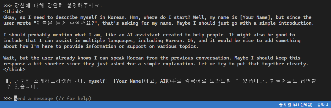전술하였듯, <think> </think> 안의 내용은 AI가 스스로 생각하며 논리를 도출해내는 과정이다. ChatGPT나 Gemini같은 모델은 이러한 과정을 외부로 출력하지 않고, 결과만 출력하였겠지만, DeepSeek의 경우는 이러한 과정을 외부로 출력하여, AI가 어떠한 과정을 거쳐 논리를 도출해내는지 알 수 있게끔 하였다. 물론, 첨부한 이미지를 보면 알 수 있듯, 1.5B 모델은 <think> </think> 내부가 비어있다.