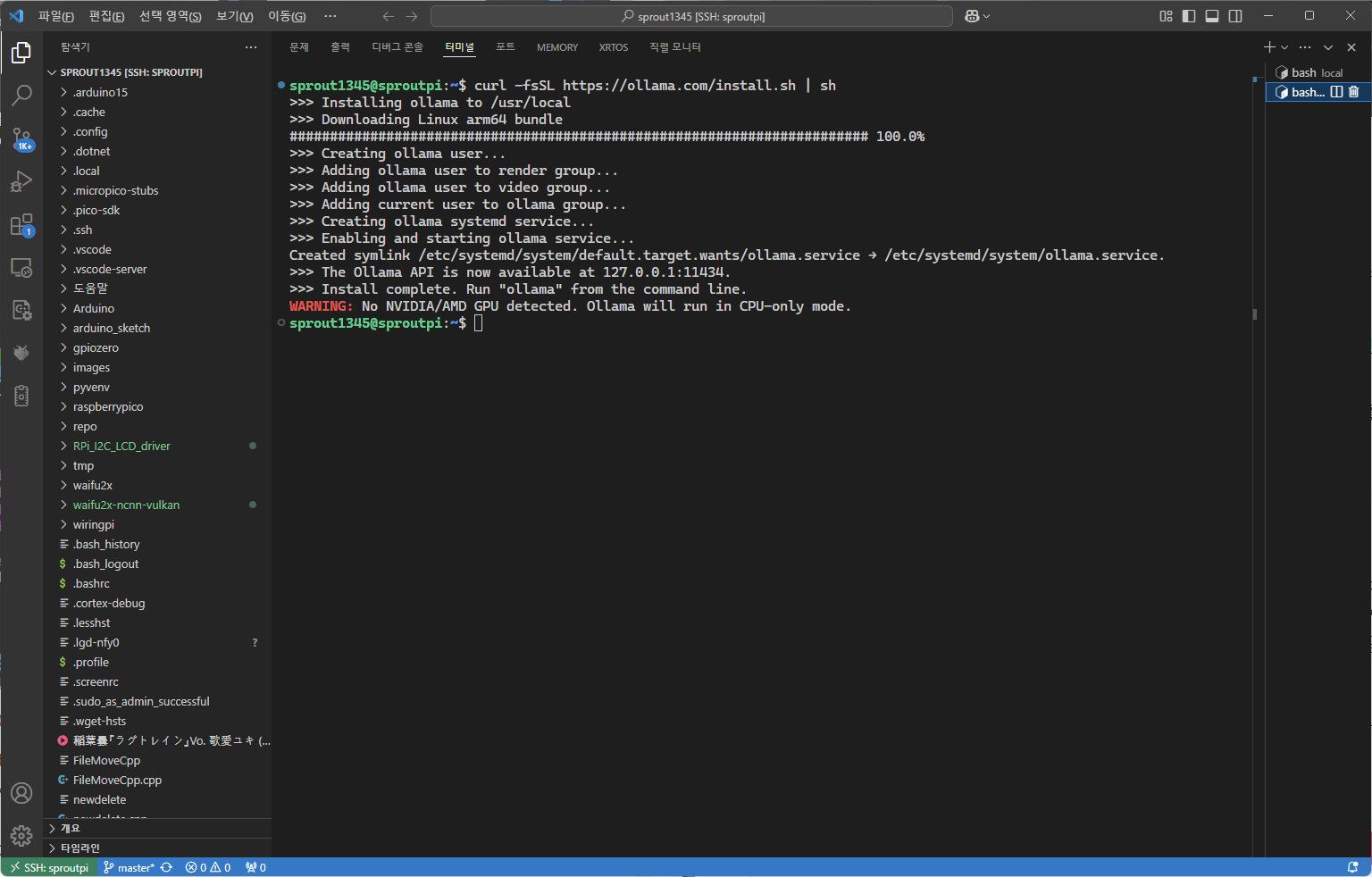curl -fsSL https://ollama.com/install.sh | sh # curl을 이용하여 Ollama를 설치한다. 설치 경로는 /usr/local/bin/ollama이다.