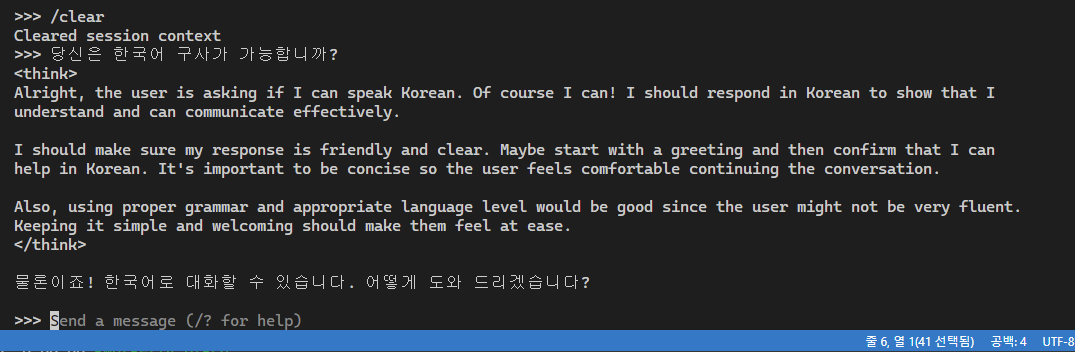 /clear를 입력하면 세션 컨텍스트가 재설정된다.