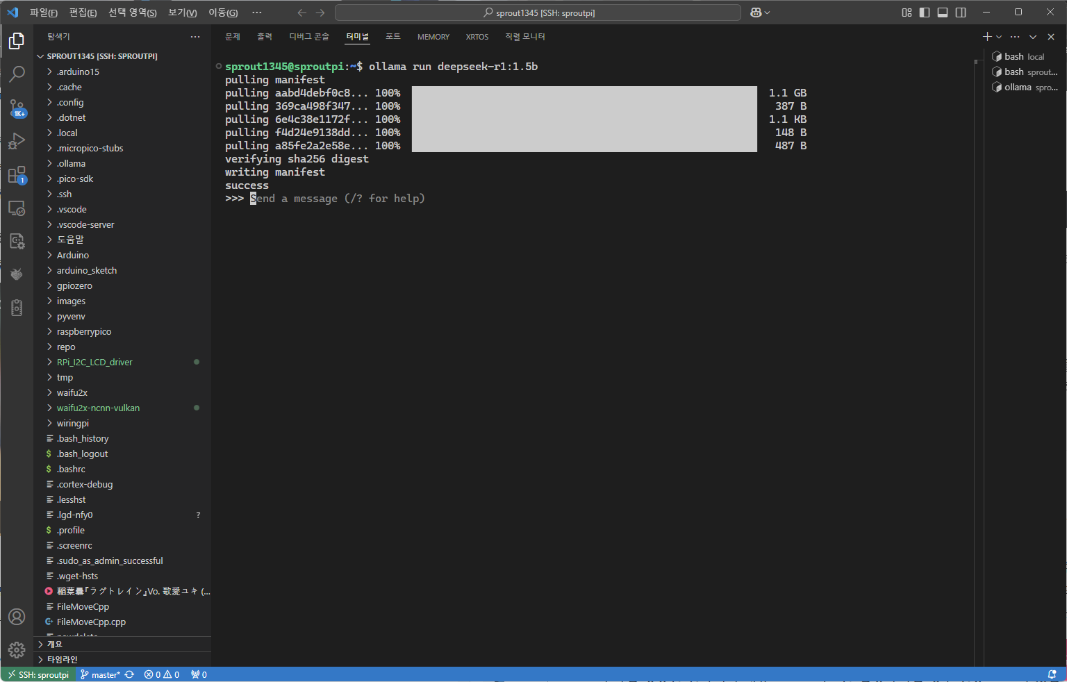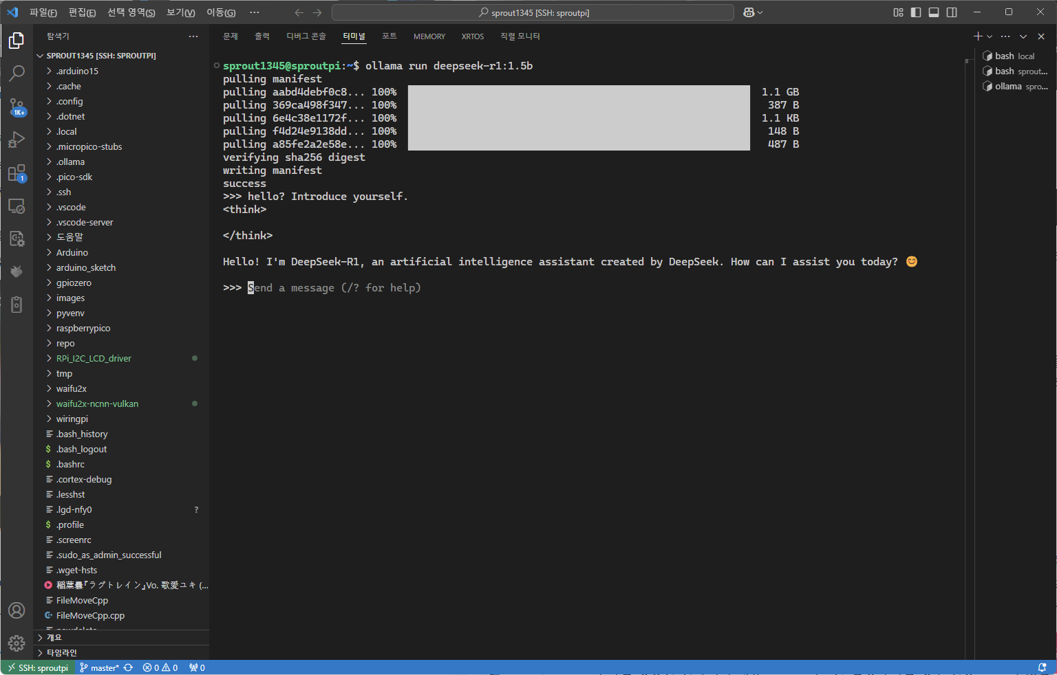 아래의 명령을 이용해, 1.5B개(15억개)의 파라미터를 가진 DeepSeek-R1을 ollama에서 구동한다.