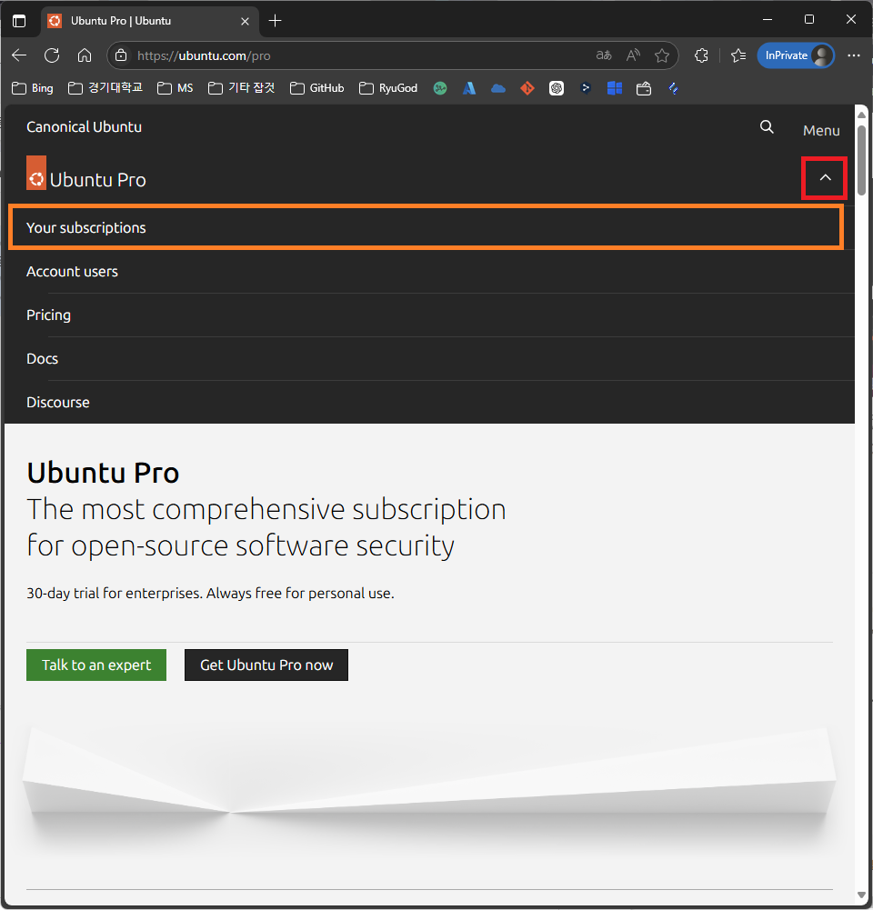 이런 페이지가 뜨는데, [Get Ubuntu Pro now]를 누르면 안된다. 저건 유료 구독 페이지이다.