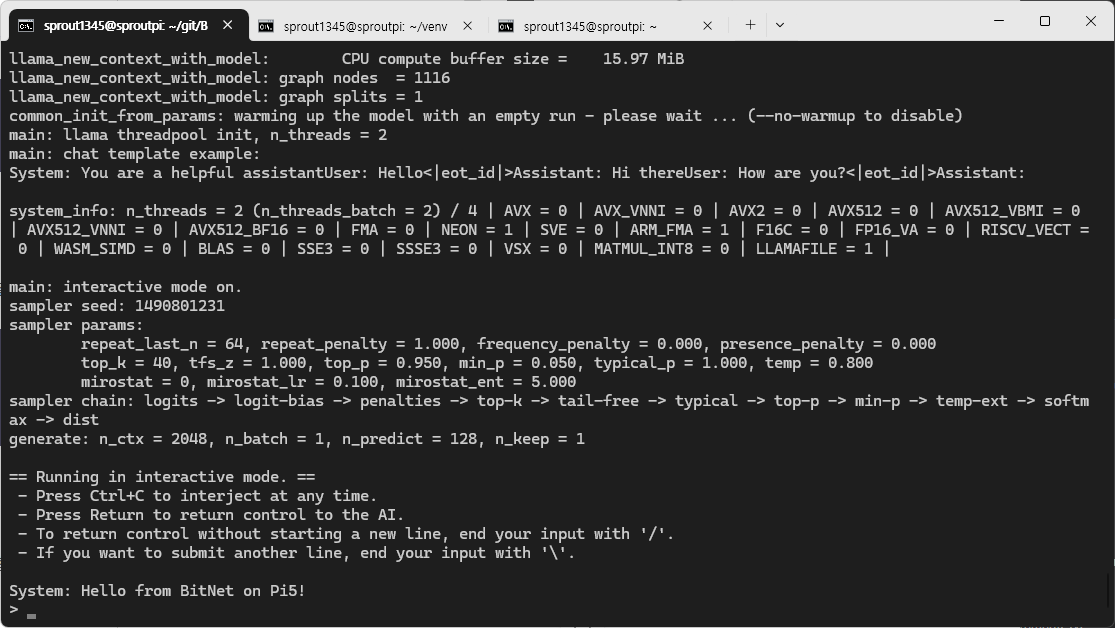 위의 명령을 실행하면 "Hello from BitNet on Pi5!"라는 주제를 가진 시스템 프롬프트를 사용하는 대화형 환경이 구성된다.