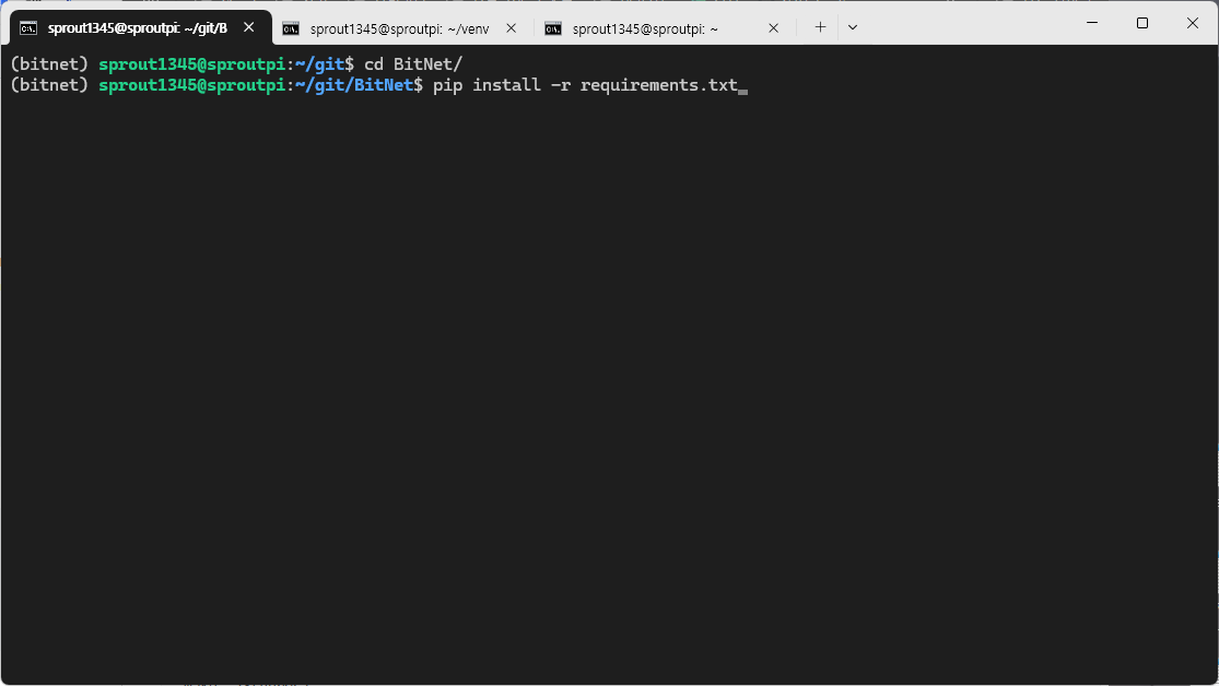 필자는 "~/venv/" 아래에 'bitnet'python3 -m venv bitnet이라는 이름의 가상환경을 구성하였다.