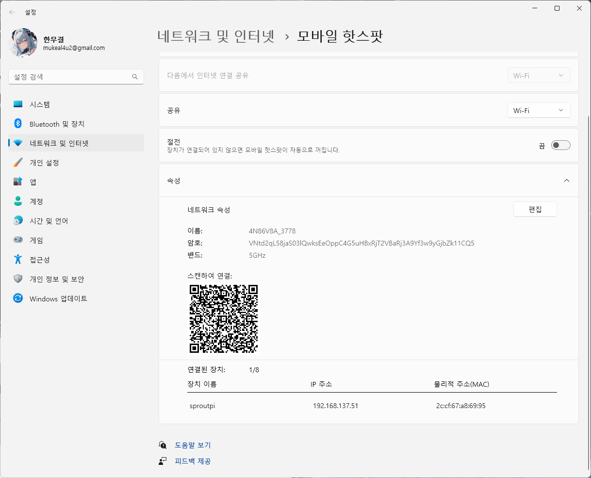 핫스팟 설정을 변경한다. 이후 라즈베리 파이가 잘 연결하는지 확인한다.