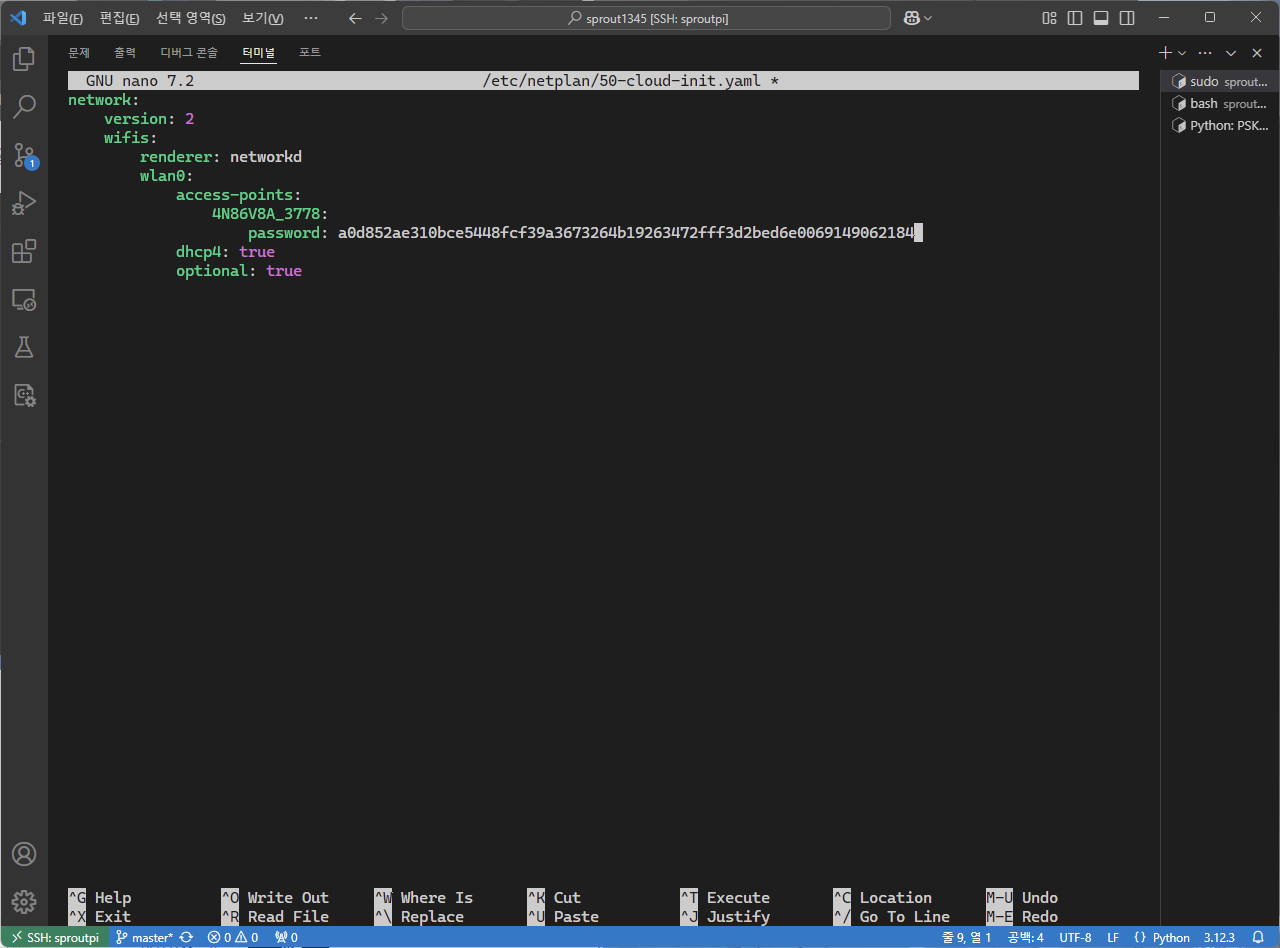 최근 핫스팟 비밀번호의 보안을 강화하고자 핫스팟 비밀번호를 변경하기로 하였고, 이에 라즈베리 파이에 저장된 비밀번호 또한 변경해 주기 위해 설정 파일을 열었다.