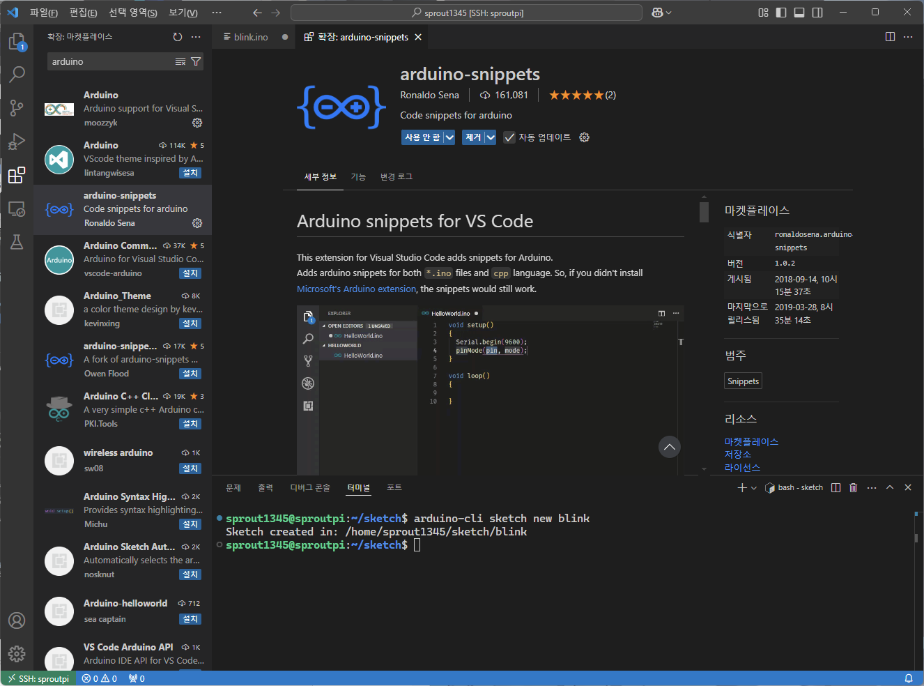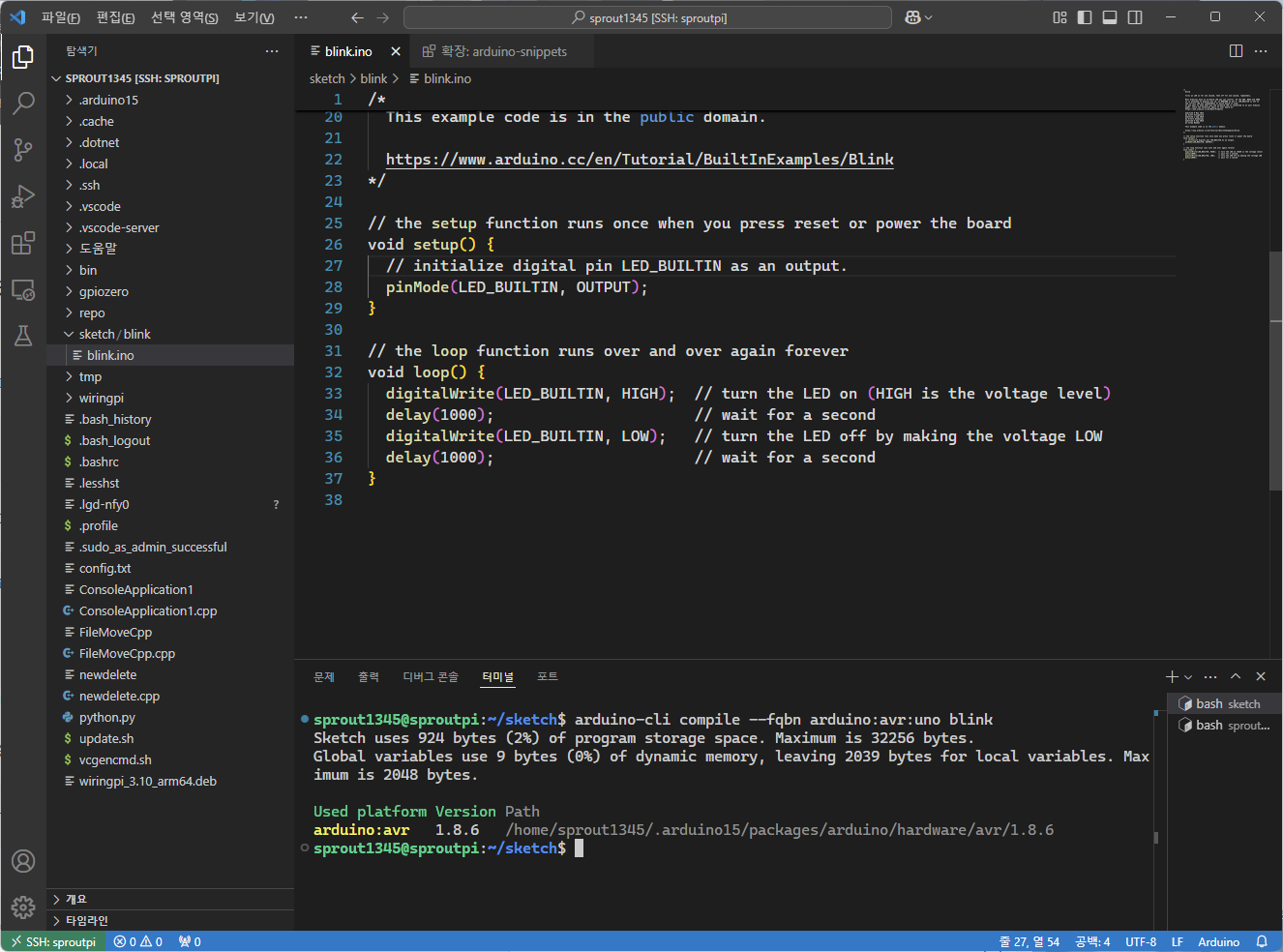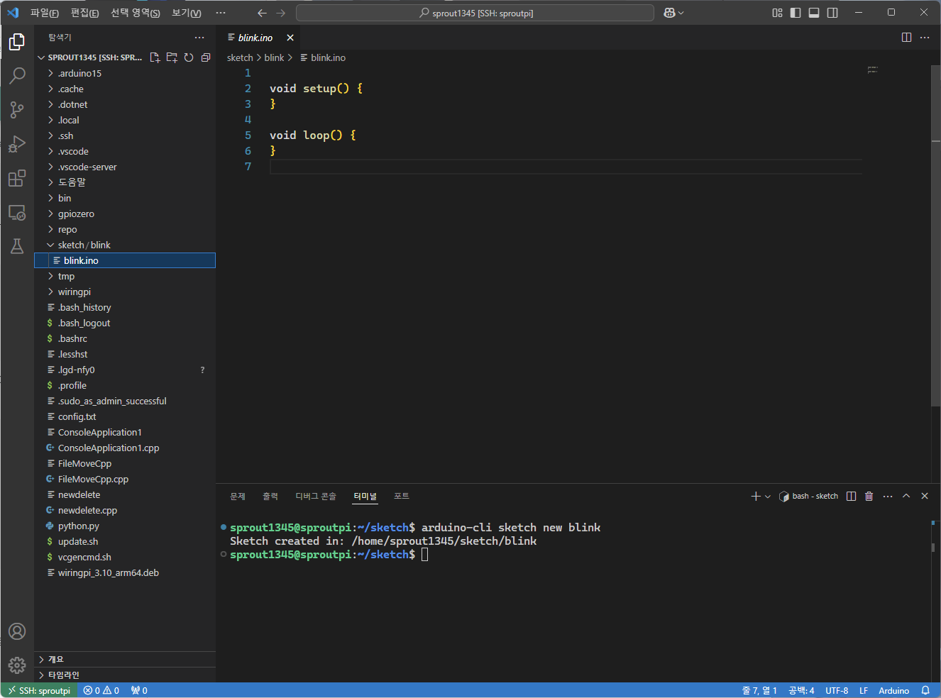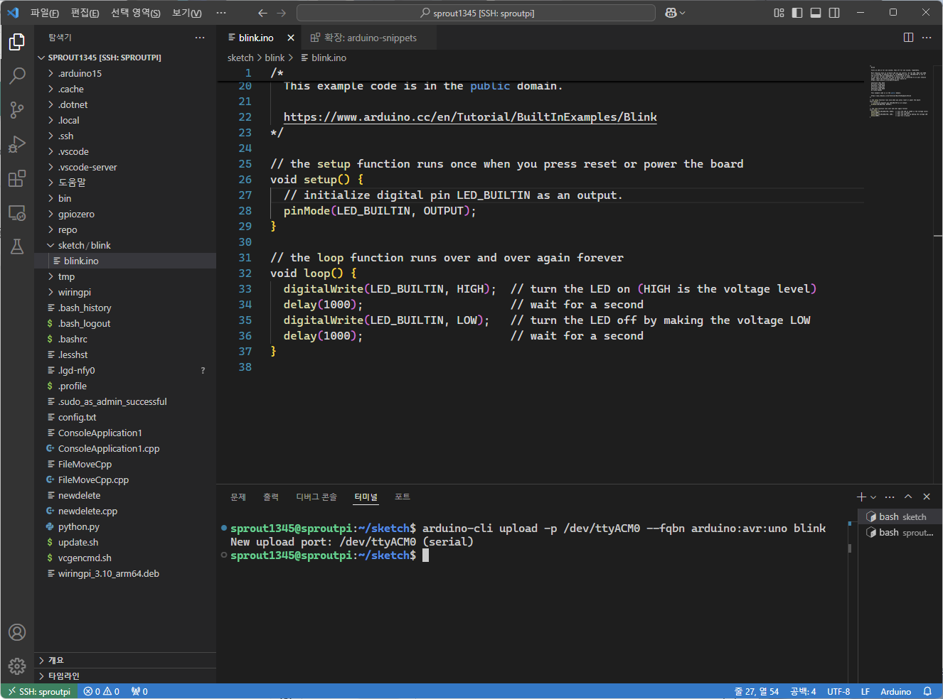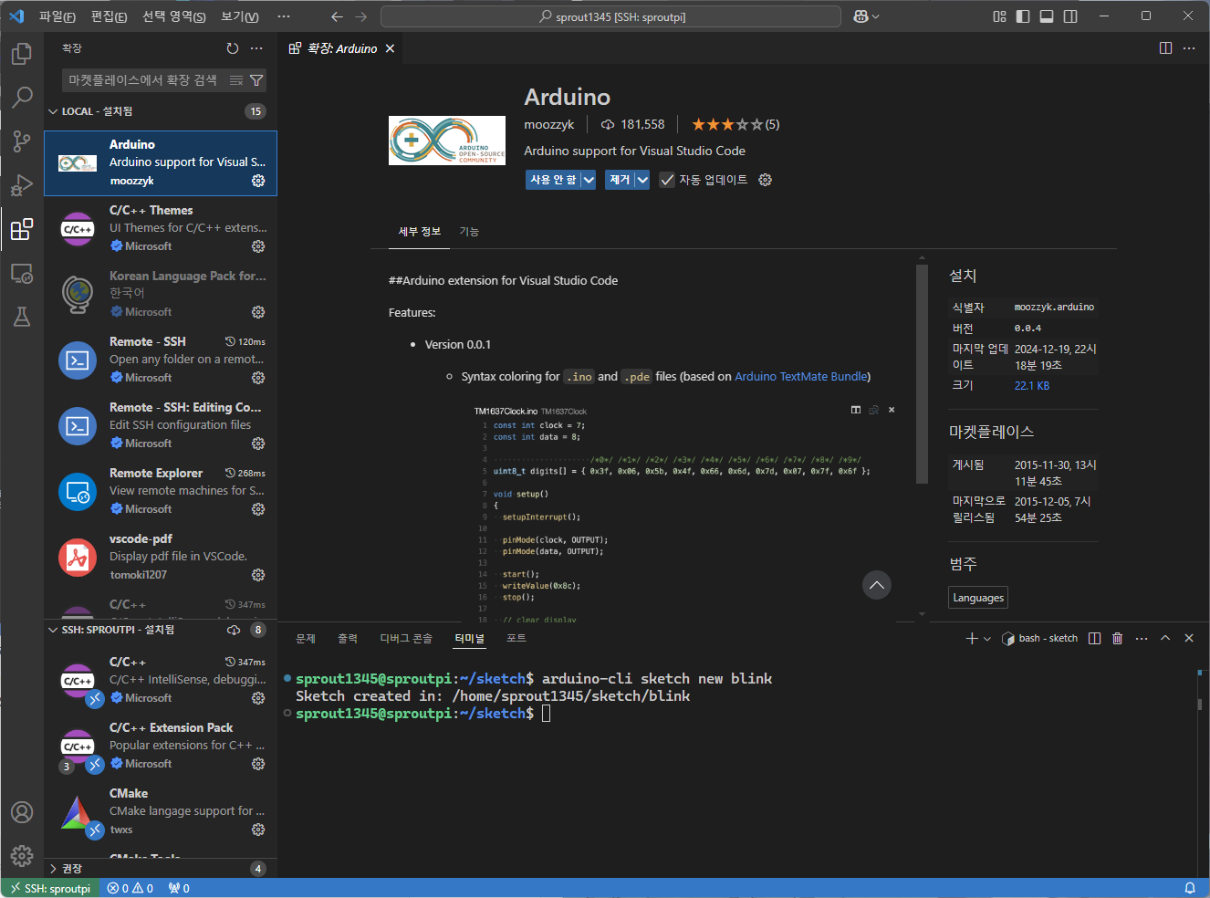 별도의 컴퓨터에서 Arduino IDE를 이용하여 스케치를 작성한 후 시스템으로 가져와도 되고, 위 이미지처럼 Visual Studio Code에 관련 Arduino 확장을 설치하고 SSH 접속으로 편집하여도 된다.